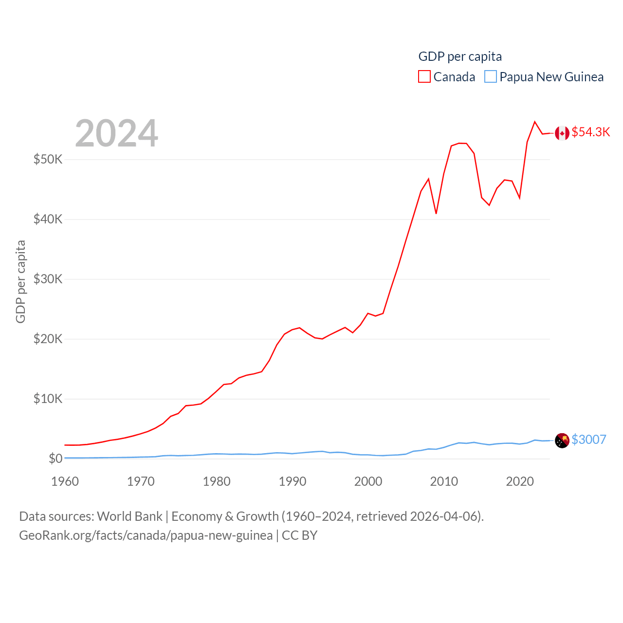 By GDP, Canada ranks 9/197 ($2.24T) and Papua New Guinea ranks 110/197 ($31.8B). By GDP per capita, Canada ranks 20/197 ($54,340), while Papua New Guinea ranks 140/197 ($3,007).
