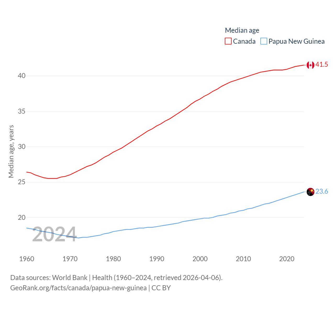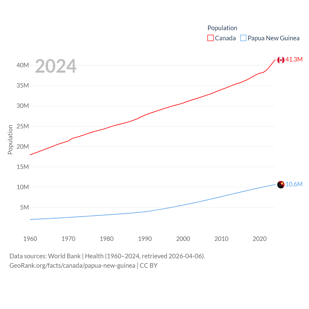 Canada has a population of 41.3M (ranked 37/197), compared with 10.6M in Papua New Guinea (ranked 92/197). Canada's land area is 3,393,336 sq mi versus 174,850 sq mi for Papua New Guinea (ranked 4th vs. 54th).