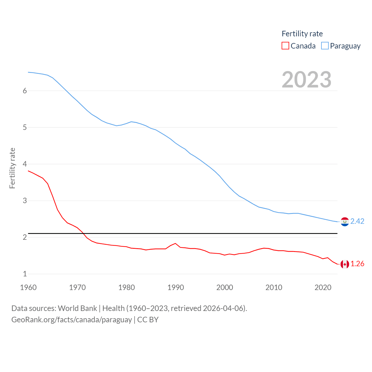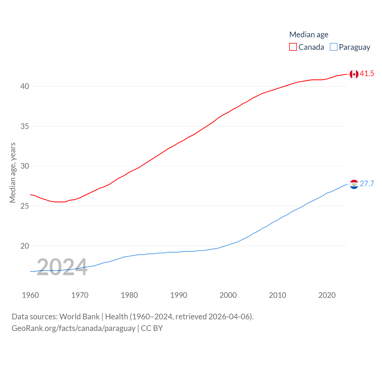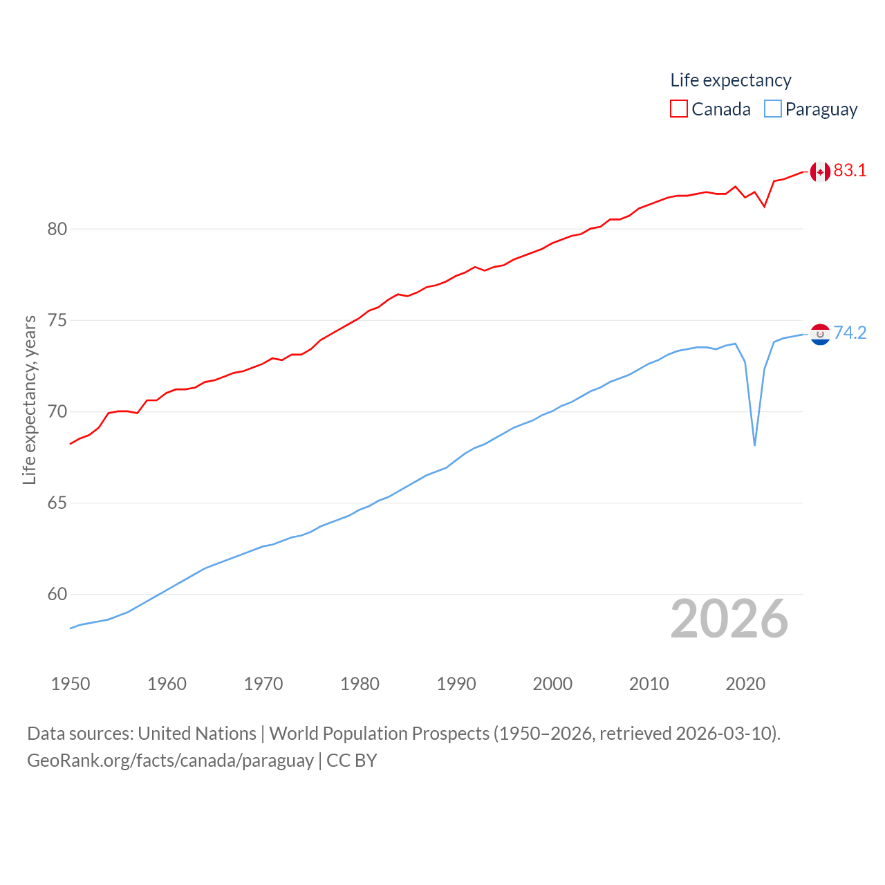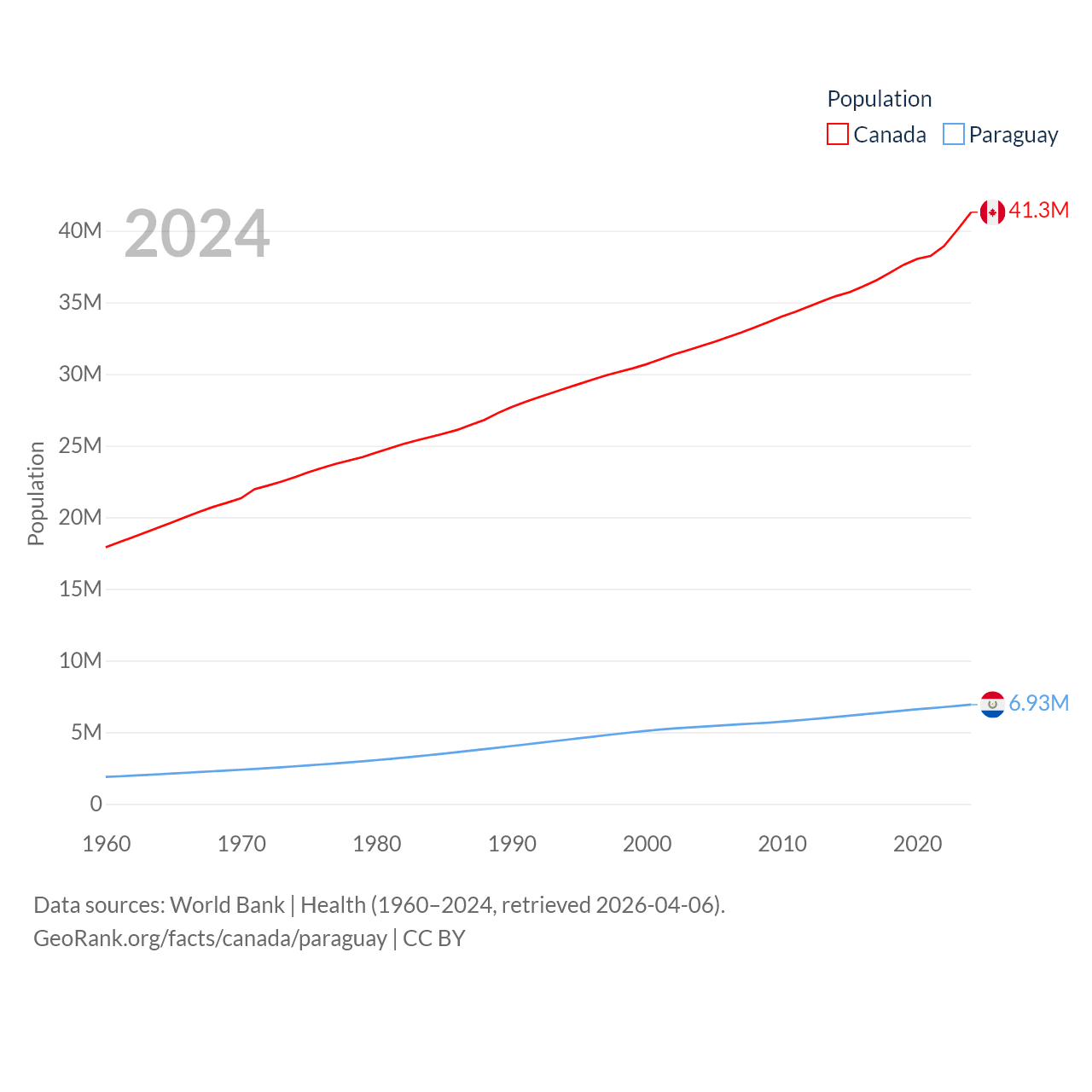 Canada has a population of 41.3M (ranked 37/197), compared with 6.93M in Paraguay (ranked 107/197). Canada's land area is 3,393,336 sq mi versus 152,901 sq mi for Paraguay (ranked 4th vs. 59th).