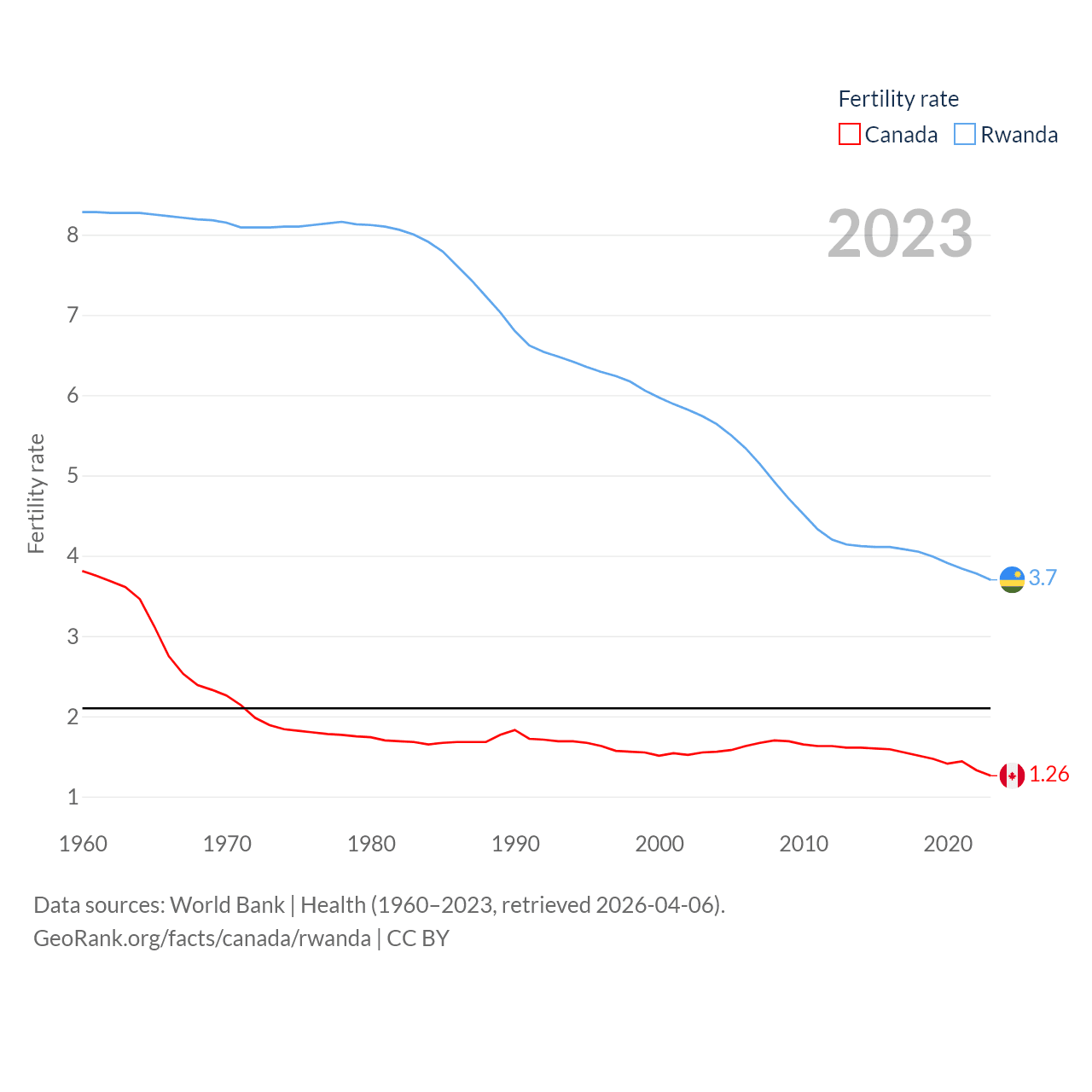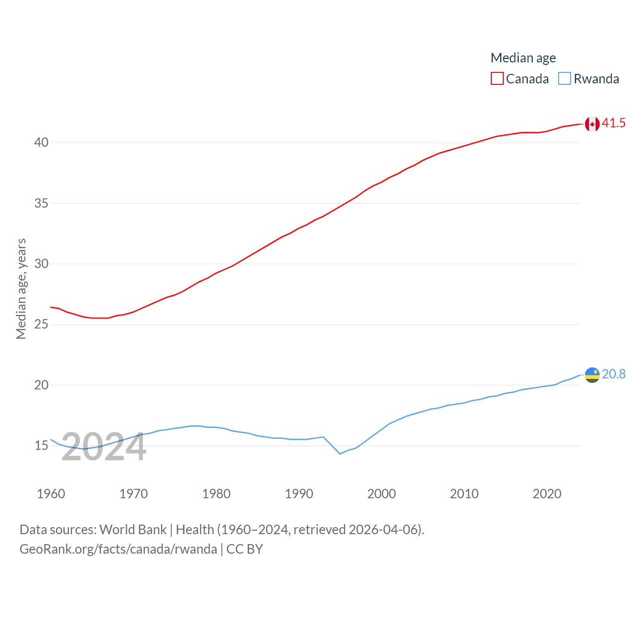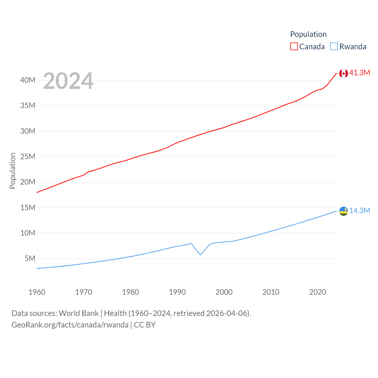 Canada has a population of 41.3M (ranked 37/197), compared with 14.3M in Rwanda (ranked 77/197). Canada's land area is 3,393,336 sq mi versus 9,525 sq mi for Rwanda (ranked 4th vs. 146th).