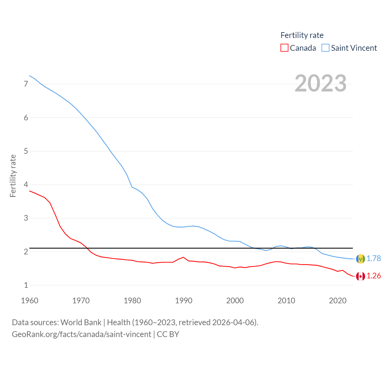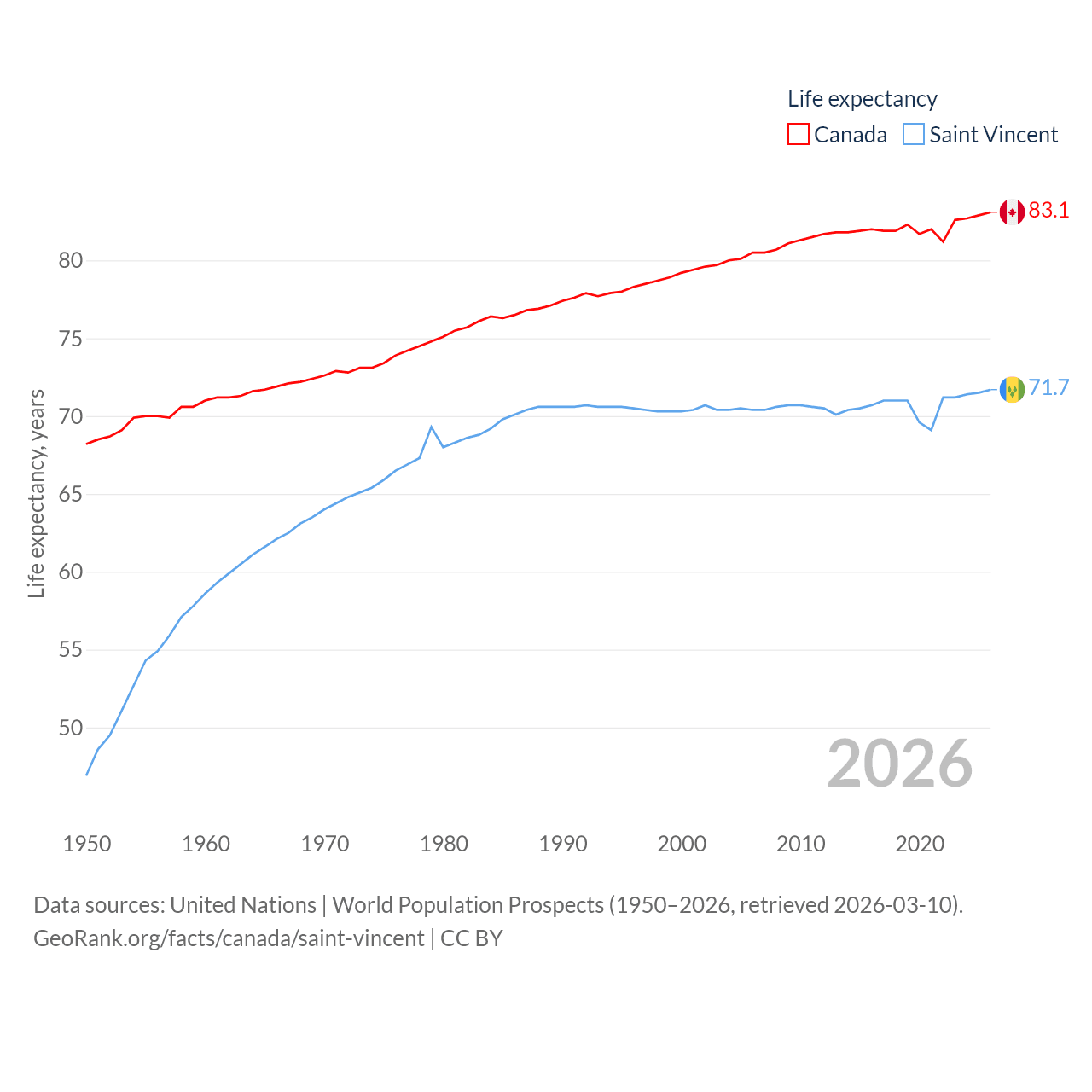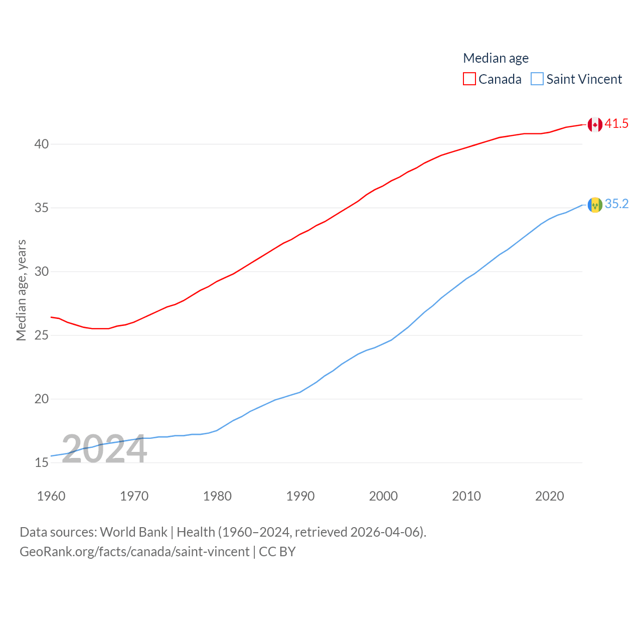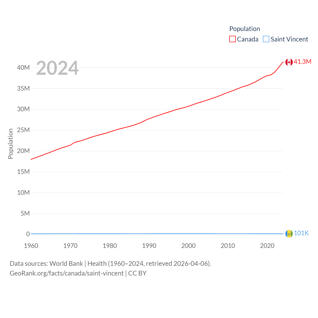 Canada has a population of 41.3M (ranked 37/197), compared with 101K in Saint Vincent (ranked 184/197). Canada's land area is 3,393,336 sq mi versus 150.6 sq mi for Saint Vincent (ranked 4th vs. 185th).