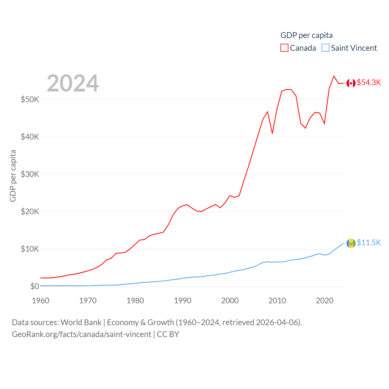 By GDP, Canada ranks 9/197 ($2.24T) and Saint Vincent ranks 186/197 ($1.16B). By GDP per capita, Canada ranks 20/197 ($54,340), while Saint Vincent ranks 81/197 ($11,501).