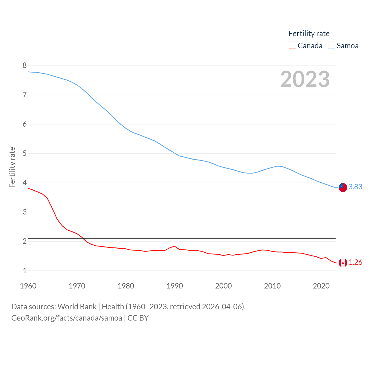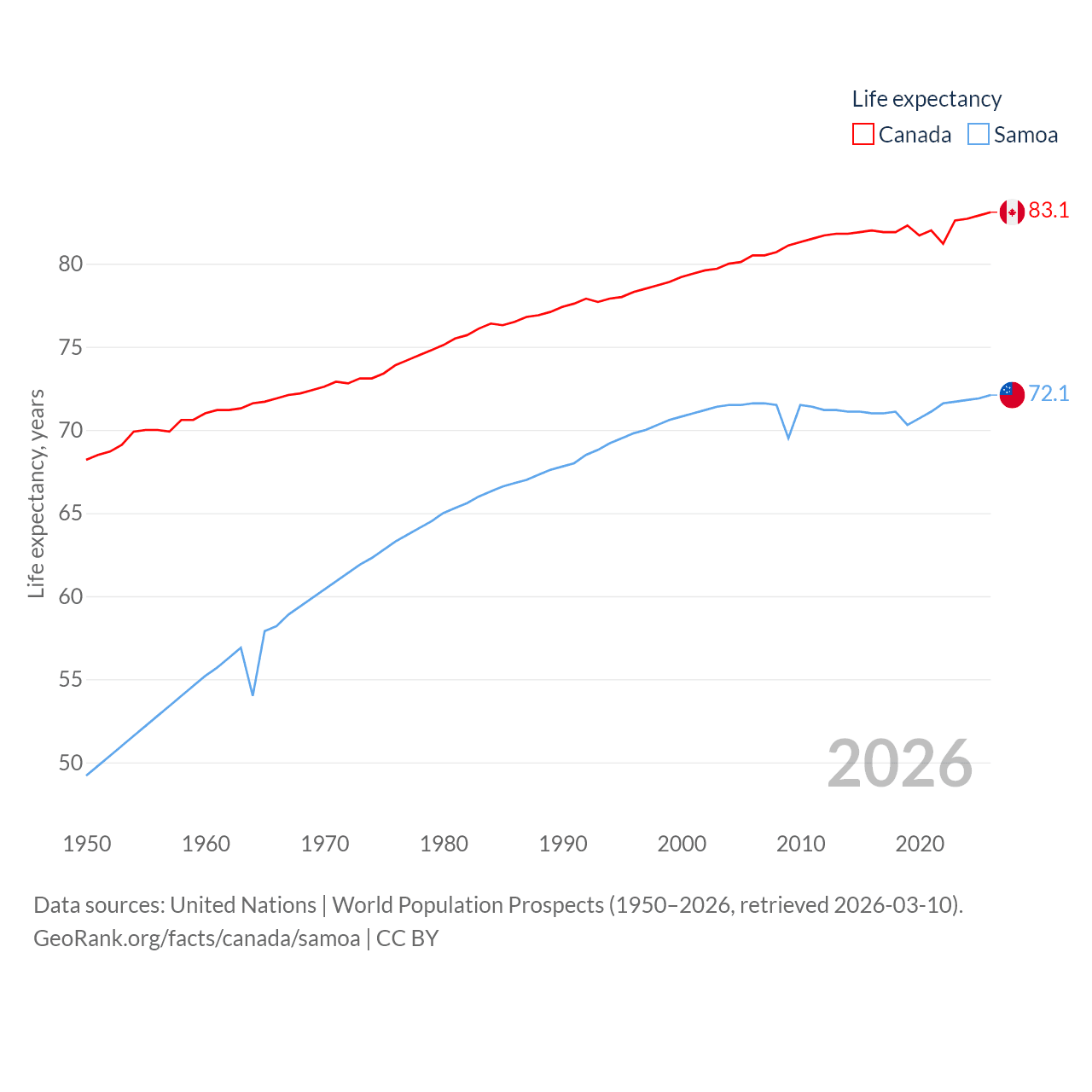 Canada has a population of 41.3M (ranked 37/197), compared with 218K in Samoa (ranked 177/197). Canada's land area is 3,393,336 sq mi versus 1,073 sq mi for Samoa (ranked 4th vs. 168th).
