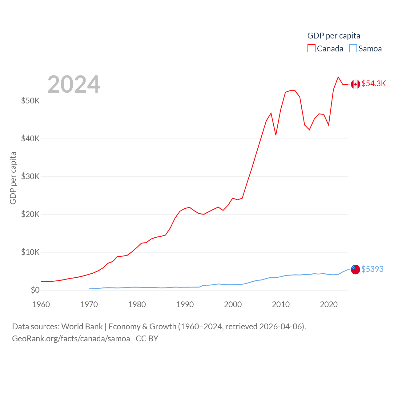 By GDP, Canada ranks 9/197 ($2.24T) and Samoa ranks 185/197 ($1.18B). By GDP per capita, Canada ranks 20/197 ($54,340), while Samoa ranks 117/197 ($5,393).