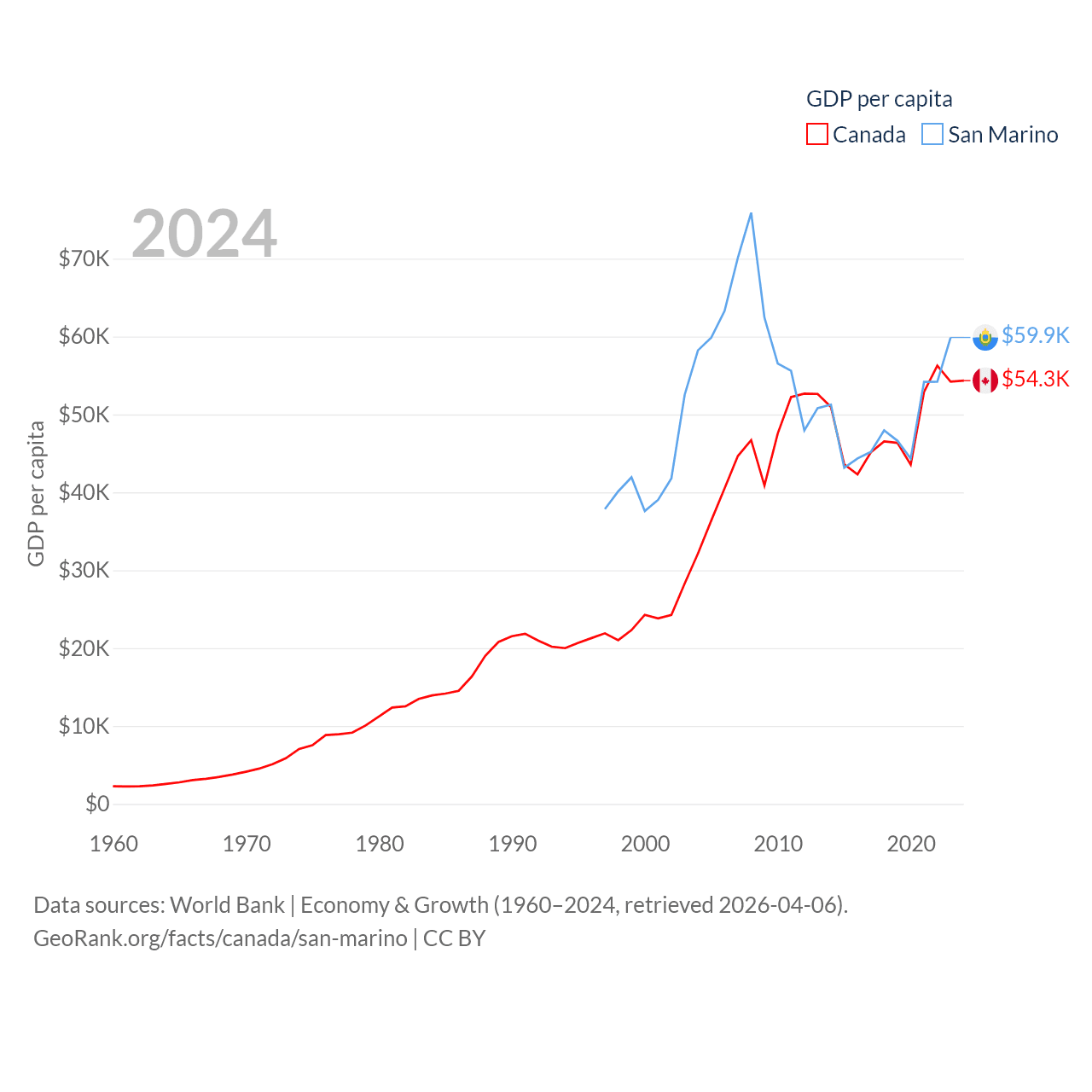 By GDP, Canada ranks 9/197 ($2.24T) and San Marino ranks 180/197 ($2.03B). By GDP per capita, Canada ranks 20/197 ($54,340), while San Marino ranks 15/197 ($59,880).