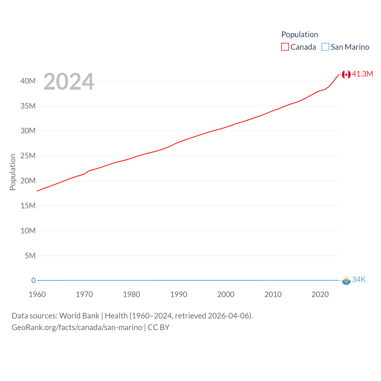 Canada has a population of 41.3M (ranked 37/197), compared with 34K in San Marino (ranked 193/197). Canada's land area is 3,393,336 sq mi versus 23.2 sq mi for San Marino (ranked 4th vs. 193rd).