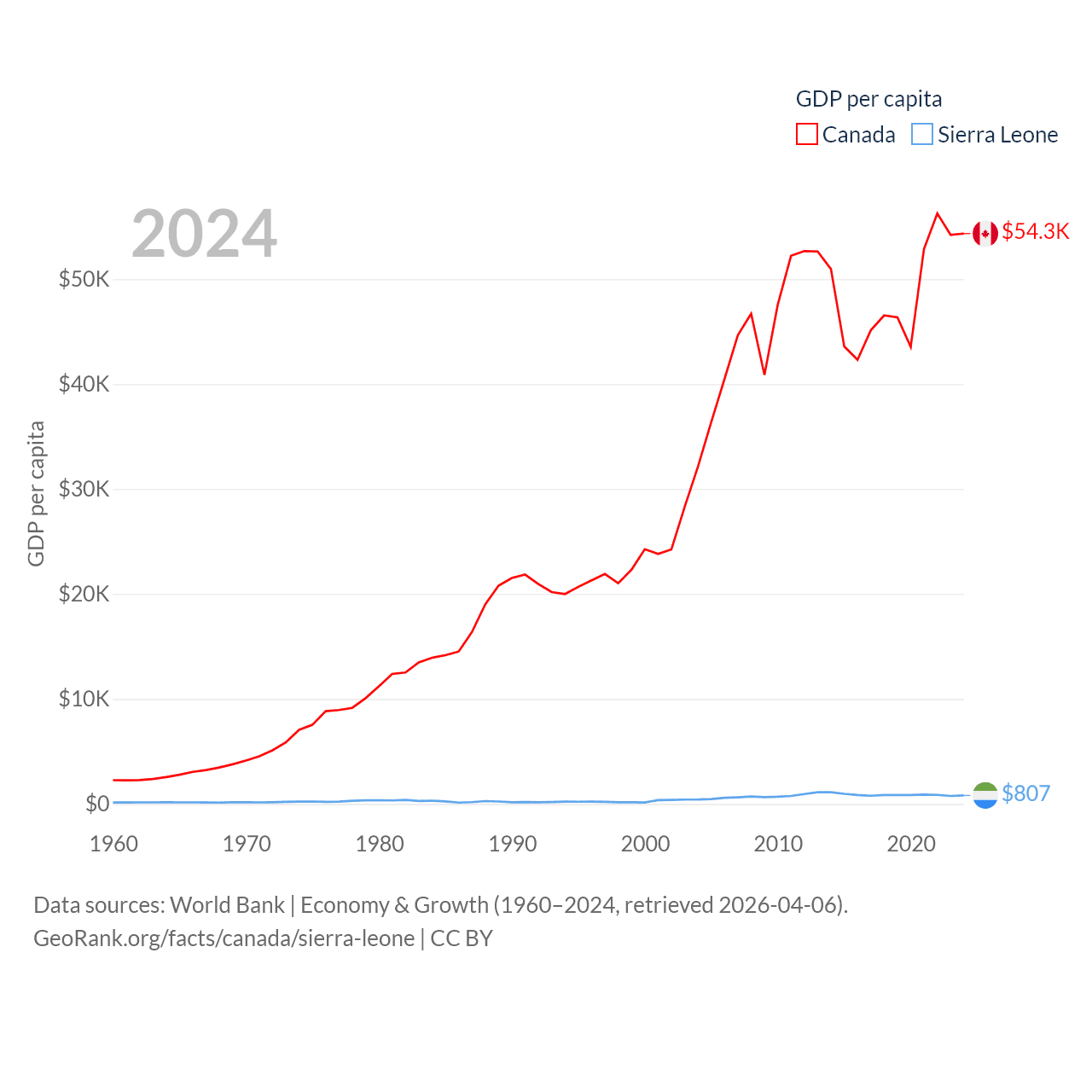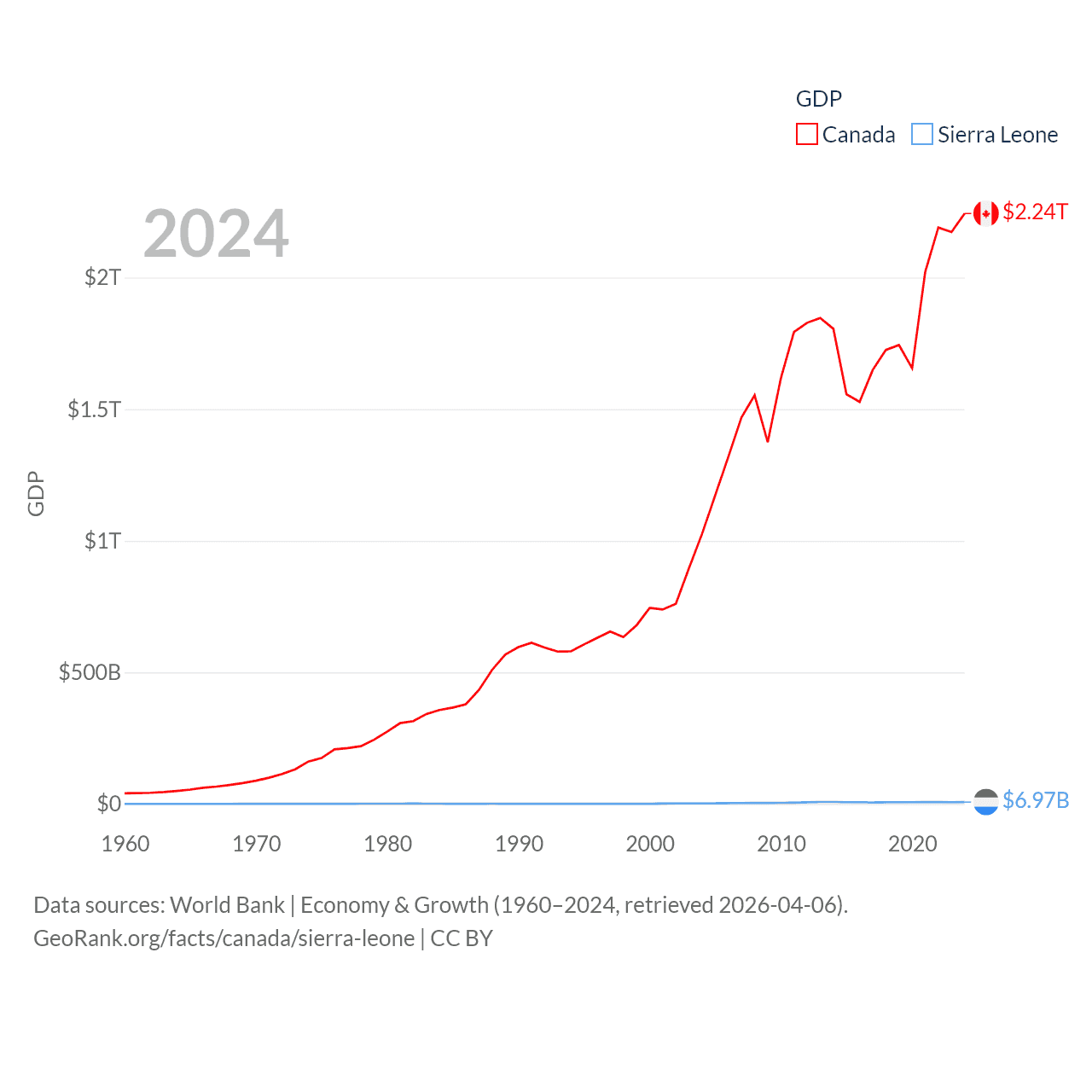 By GDP, Canada ranks 9/197 ($2.24T) and Sierra Leone ranks 160/197 ($6.97B). By GDP per capita, Canada ranks 20/197 ($54,340), while Sierra Leone ranks 186/197 ($807).