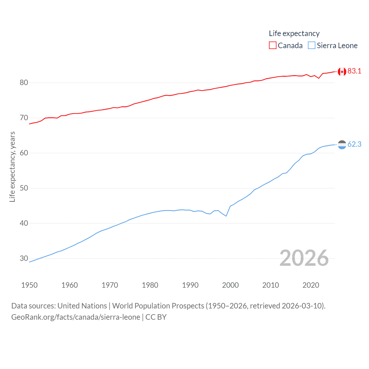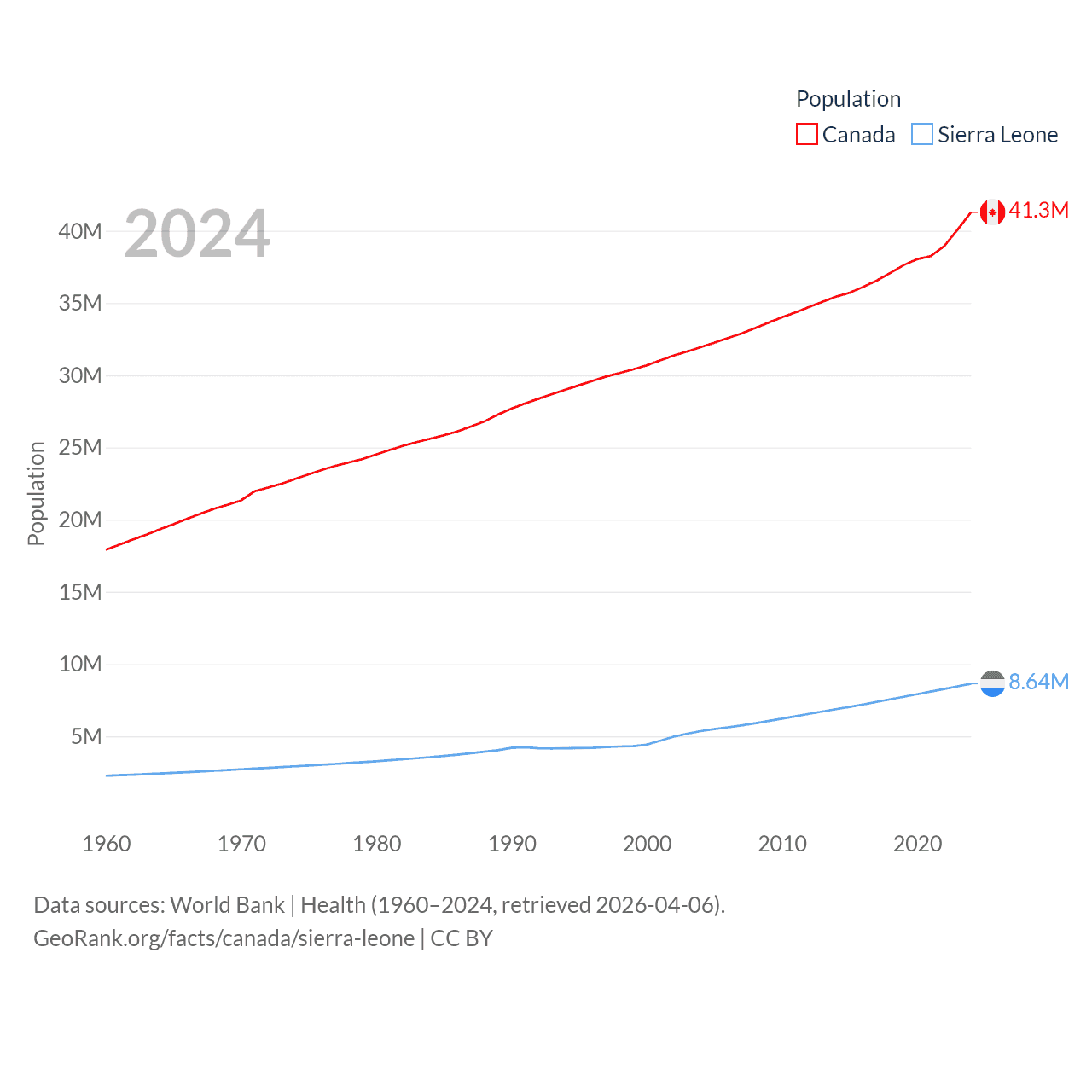 Canada has a population of 41.3M (ranked 37/197), compared with 8.64M in Sierra Leone (ranked 102/197). Canada's land area is 3,393,336 sq mi versus 27,869 sq mi for Sierra Leone (ranked 4th vs. 116th).