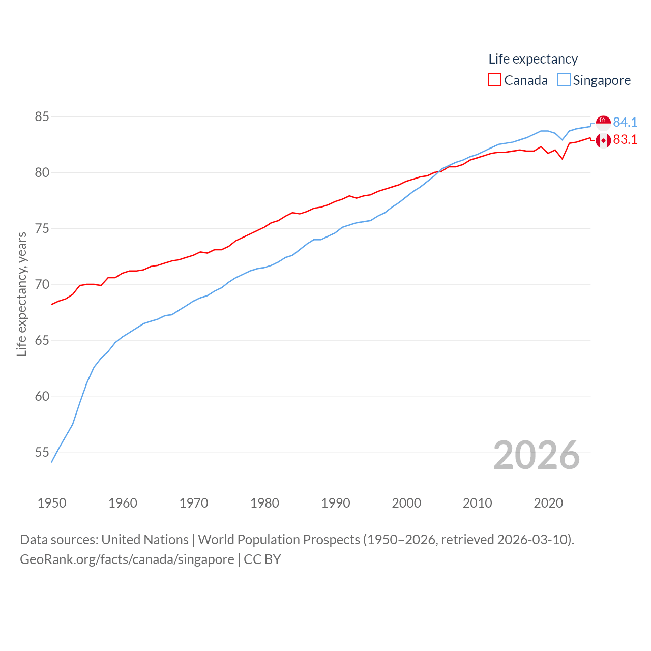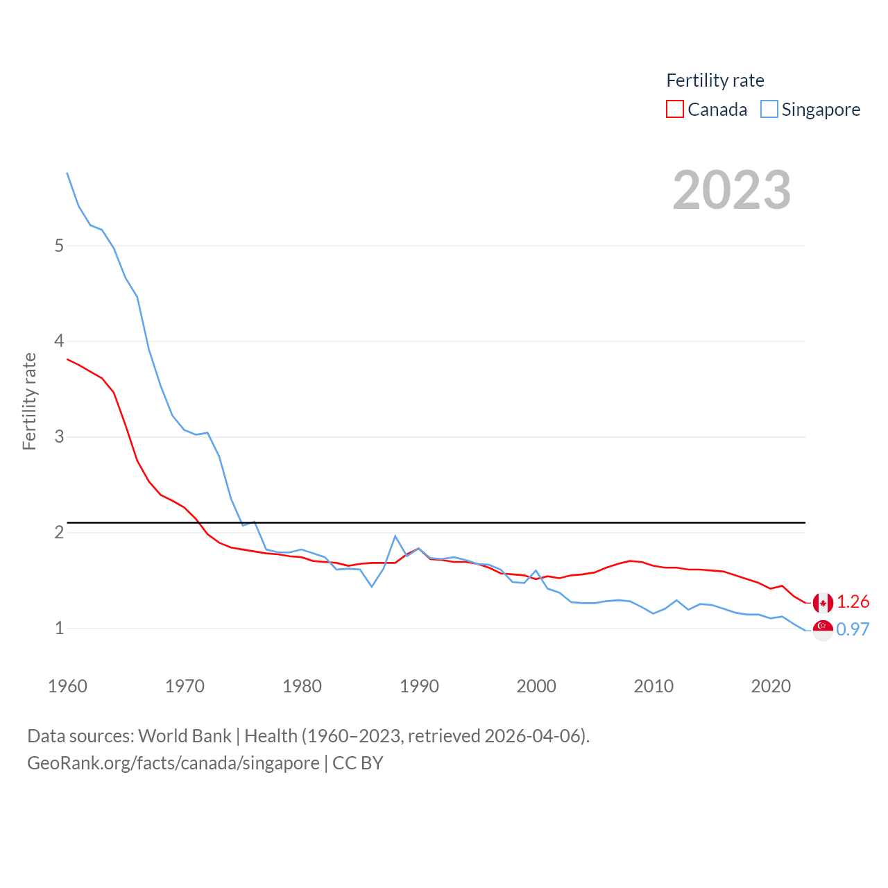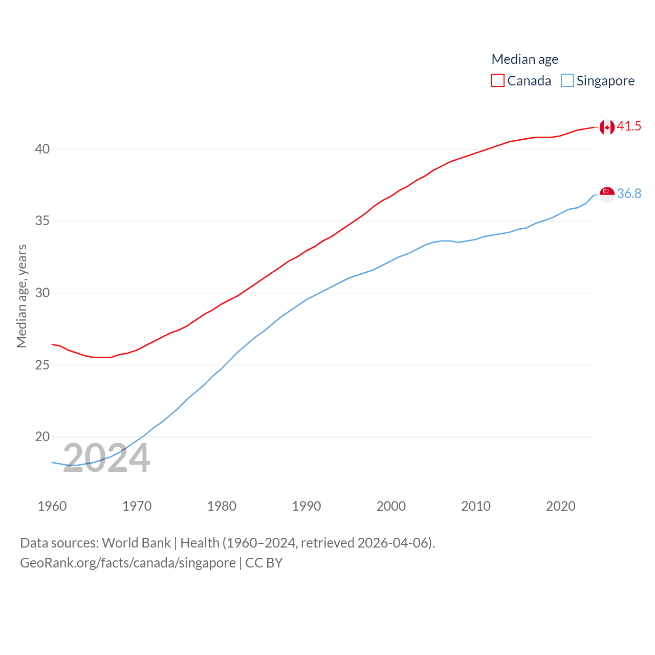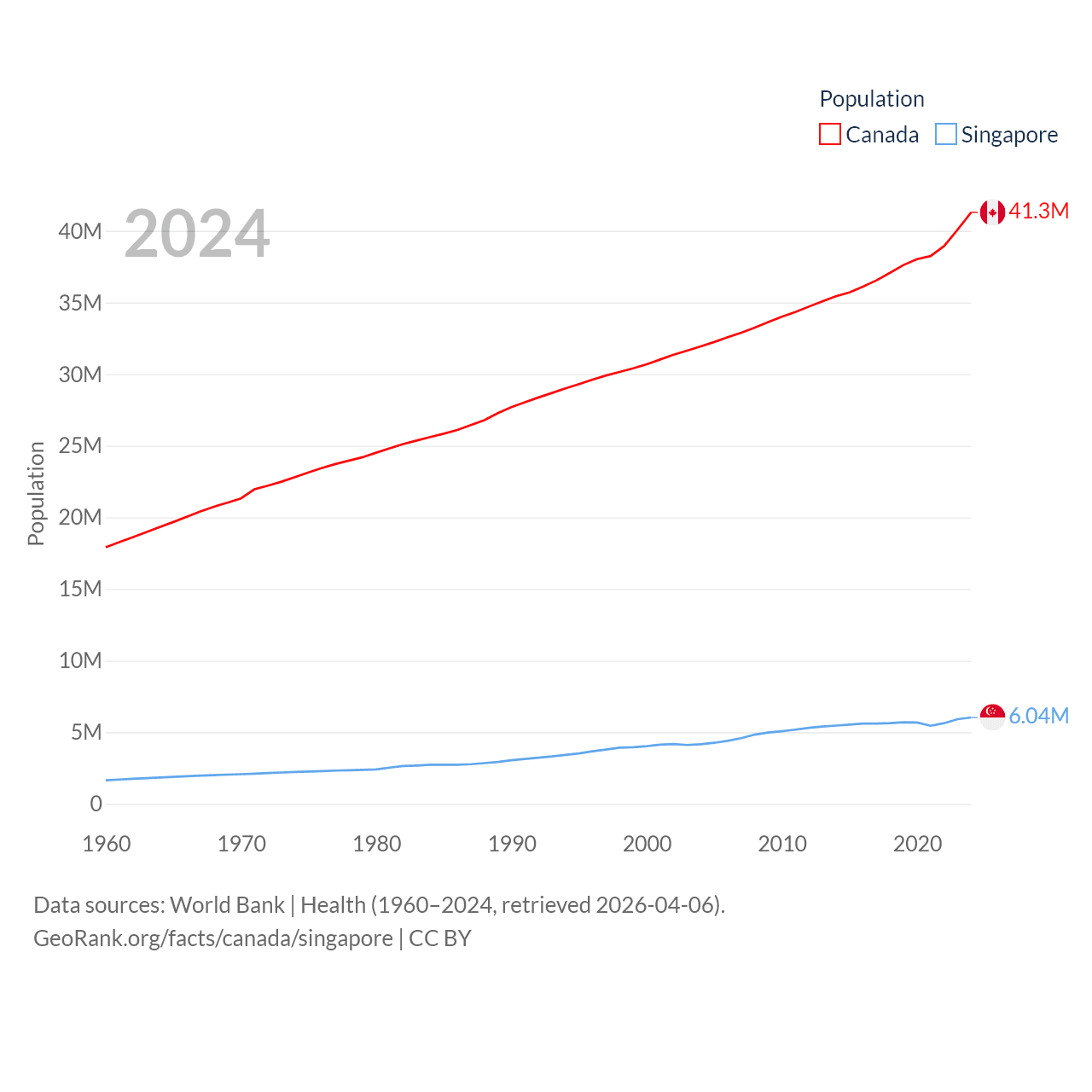 Canada has a population of 41.3M (ranked 37/197), compared with 6.04M in Singapore (ranked 113/197). Canada's land area is 3,393,336 sq mi versus 277.2 sq mi for Singapore (ranked 4th vs. 177th).