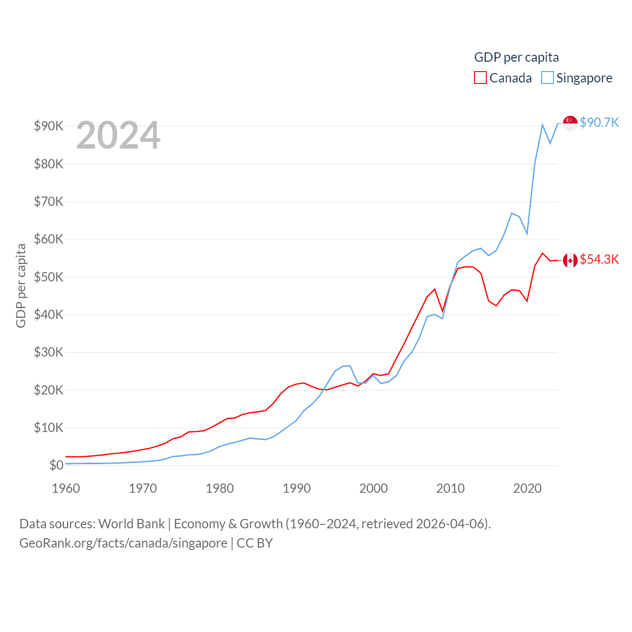 By GDP, Canada ranks 9/197 ($2.24T) and Singapore ranks 28/197 ($547B). By GDP per capita, Canada ranks 20/197 ($54,340), while Singapore ranks 7/197 ($90,674).