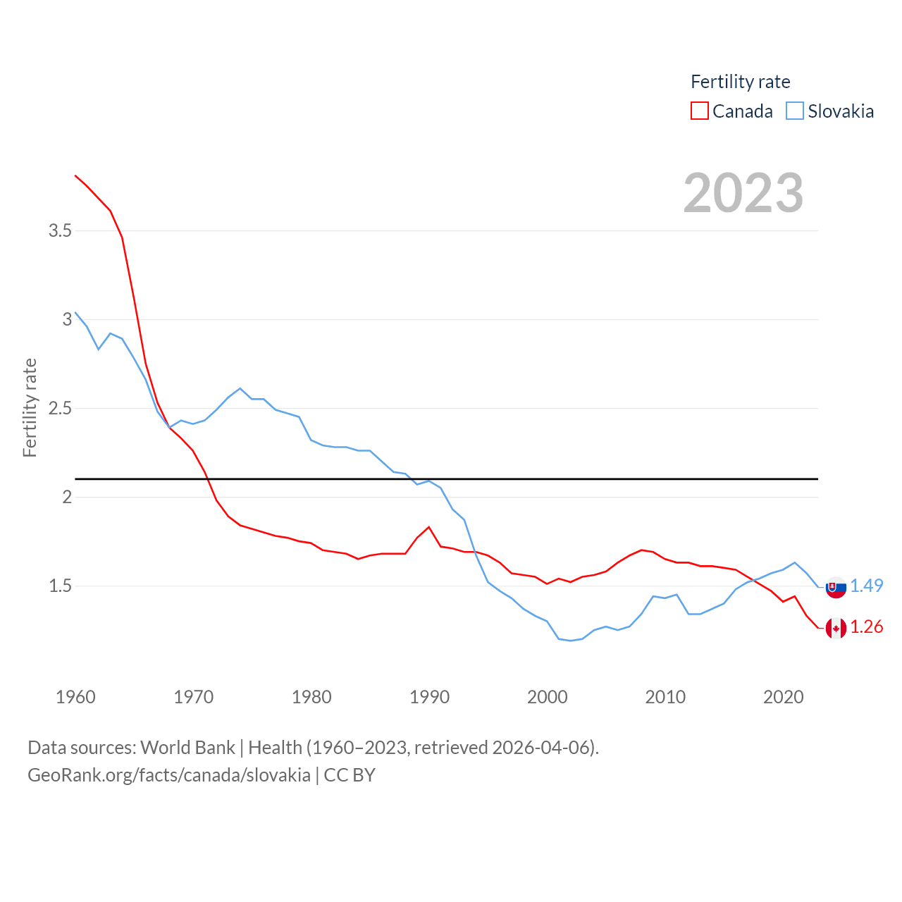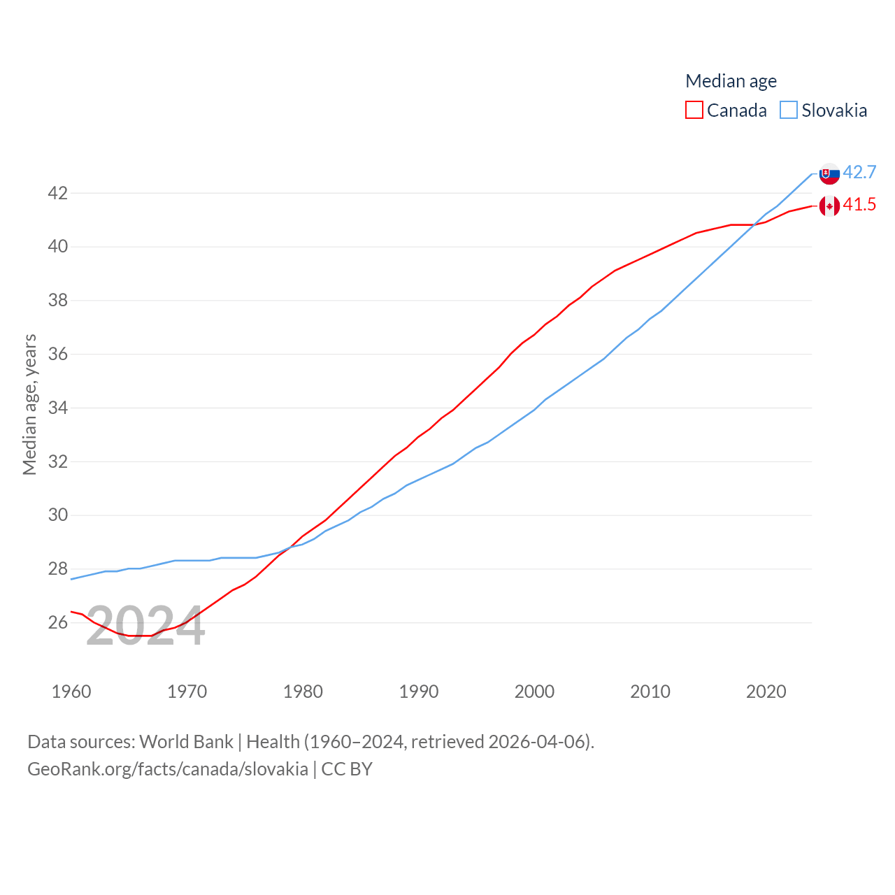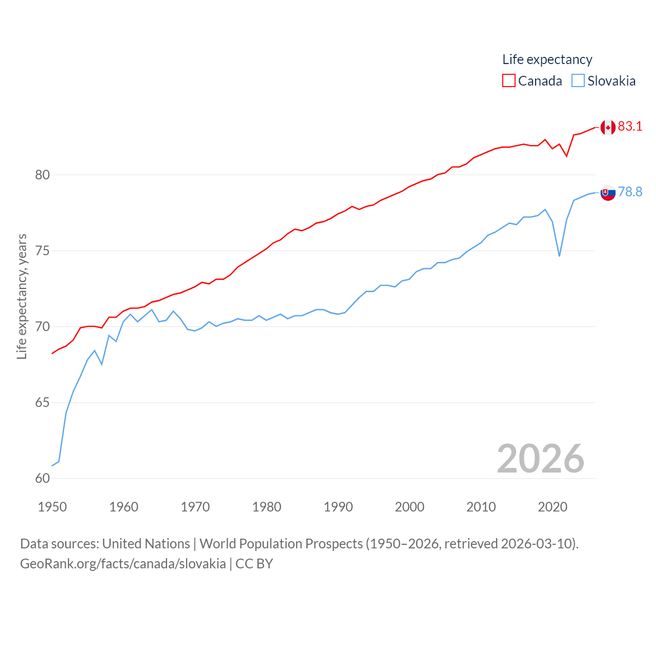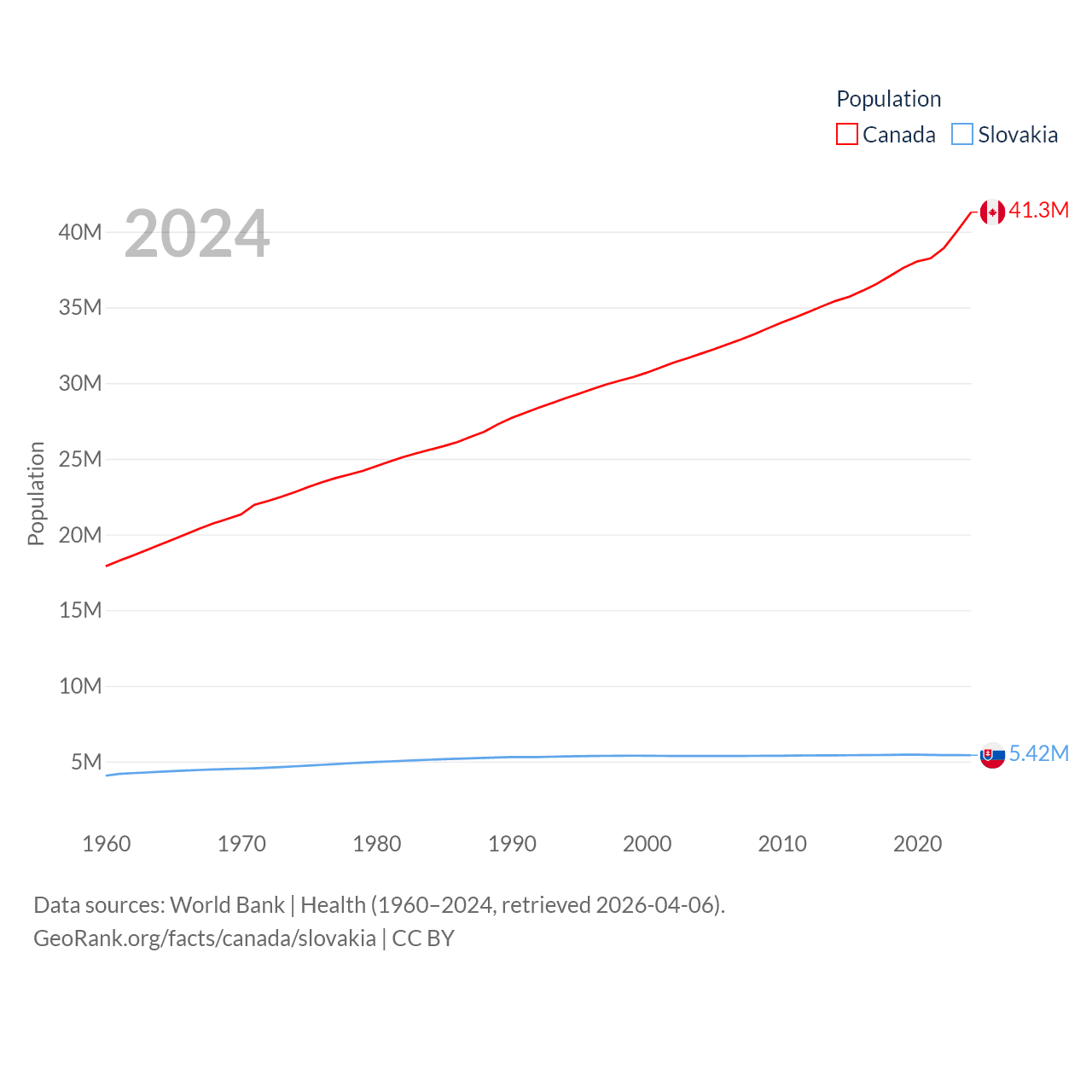 Canada has a population of 41.3M (ranked 37/197), compared with 5.42M in Slovakia (ranked 119/197). Canada's land area is 3,393,336 sq mi versus 18,564 sq mi for Slovakia (ranked 4th vs. 128th).