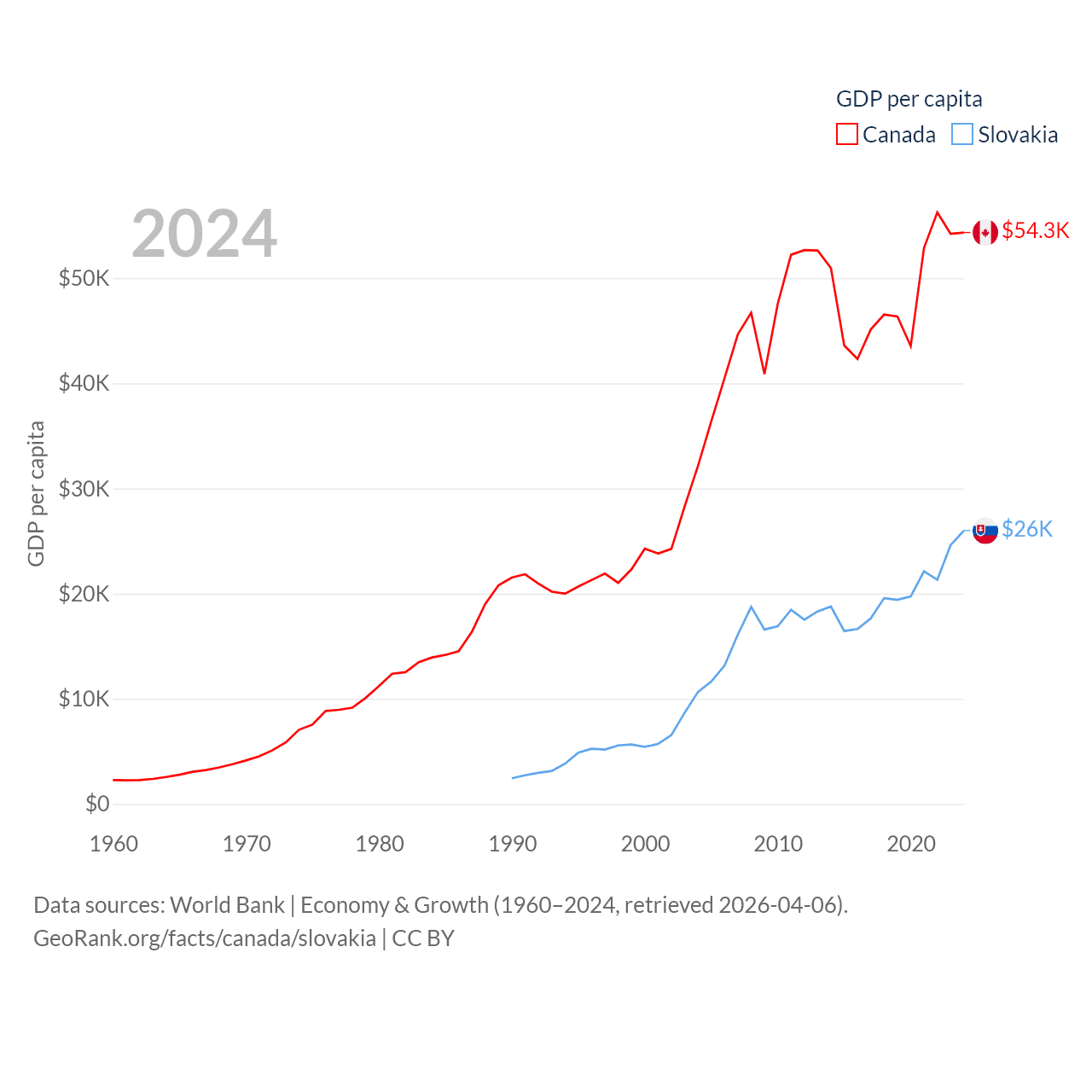 By GDP, Canada ranks 9/197 ($2.24T) and Slovakia ranks 61/197 ($141B). By GDP per capita, Canada ranks 20/197 ($54,340), while Slovakia ranks 47/197 ($25,993).
