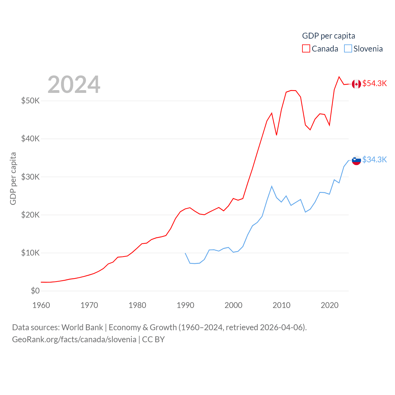 By GDP, Canada ranks 9/197 ($2.24T) and Slovenia ranks 86/197 ($73B). By GDP per capita, Canada ranks 20/197 ($54,340), while Slovenia ranks 34/197 ($34,301).