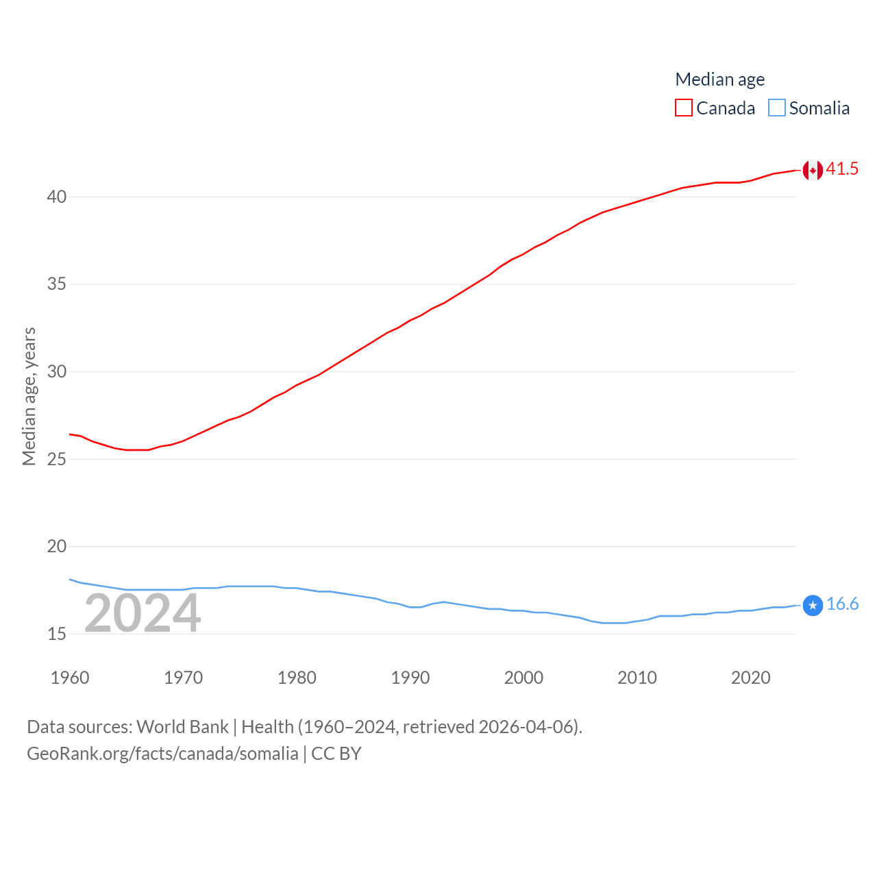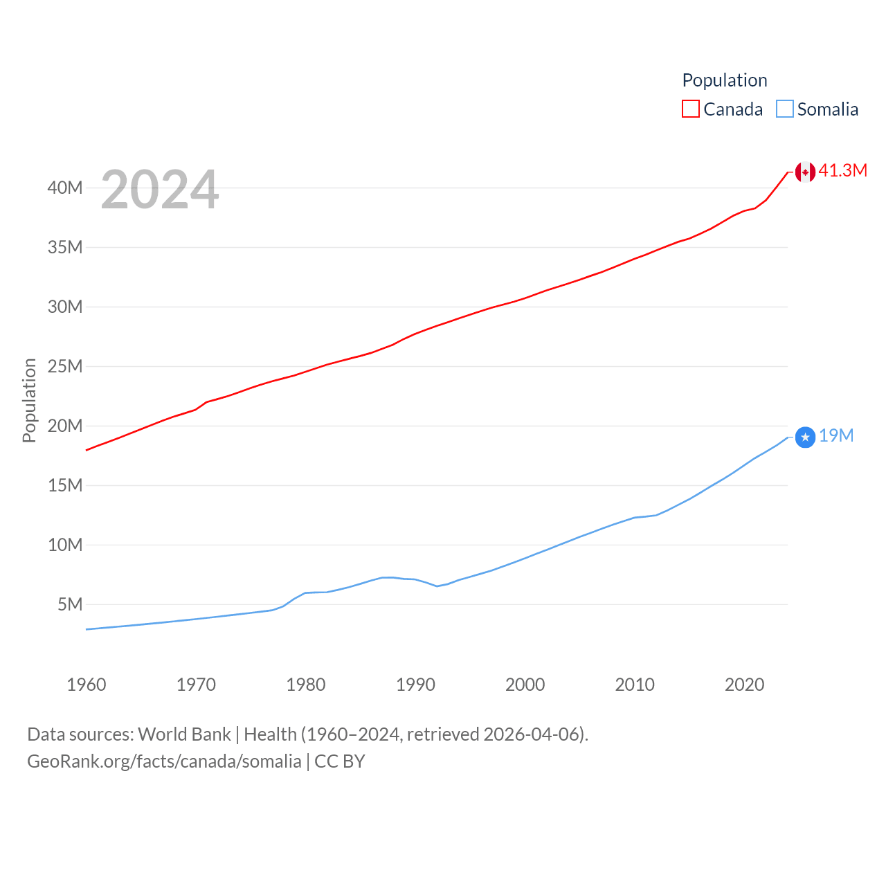 Canada has a population of 41.3M (ranked 37/197), compared with 19M in Somalia (ranked 68/197). Canada's land area is 3,393,336 sq mi versus 242,217 sq mi for Somalia (ranked 4th vs. 42nd).