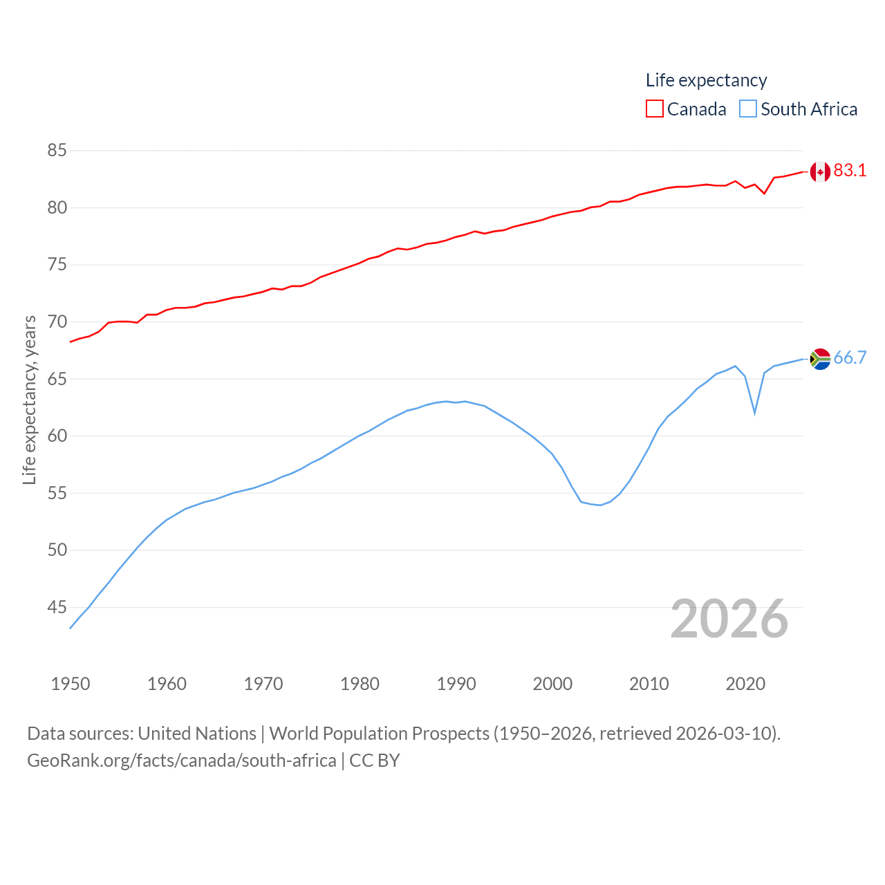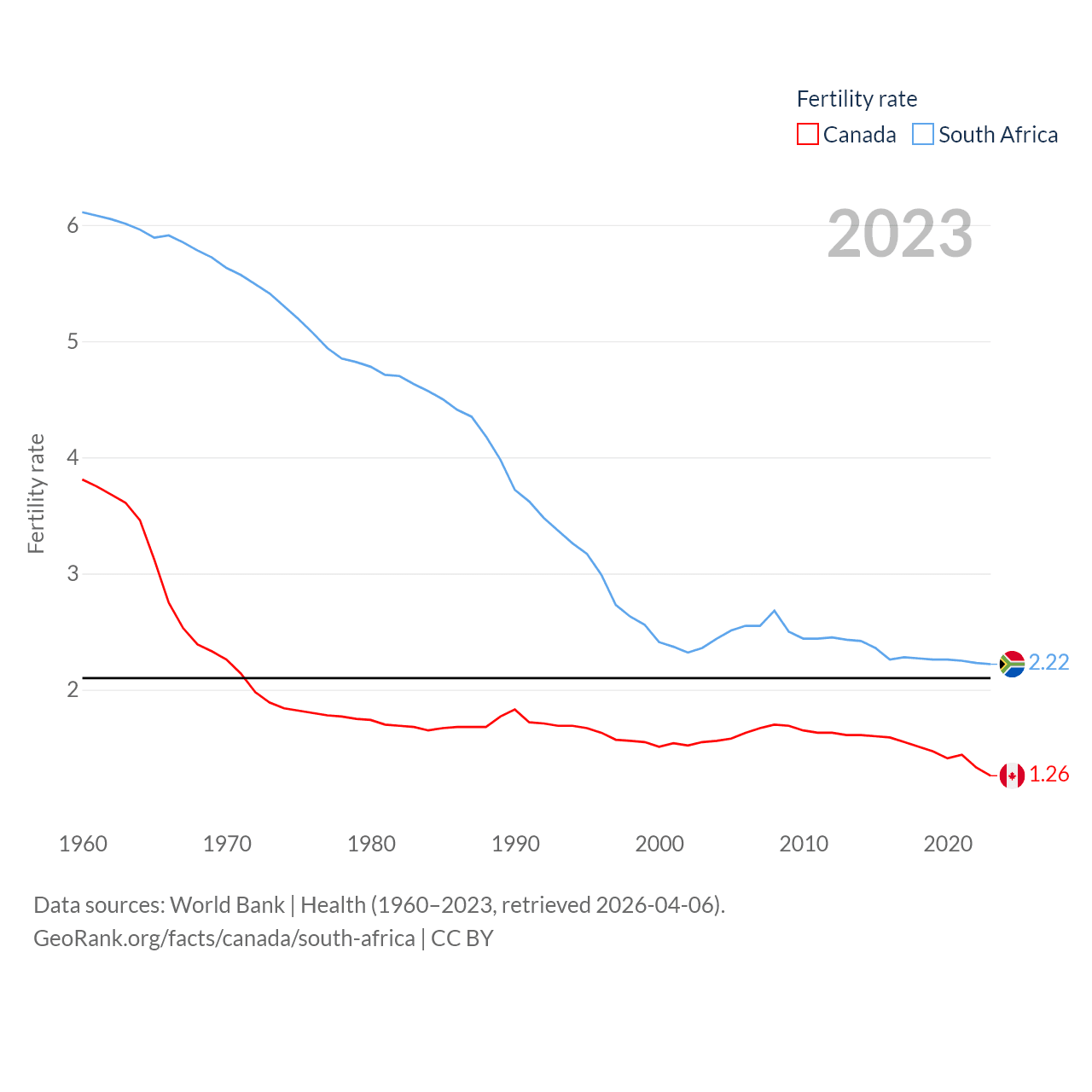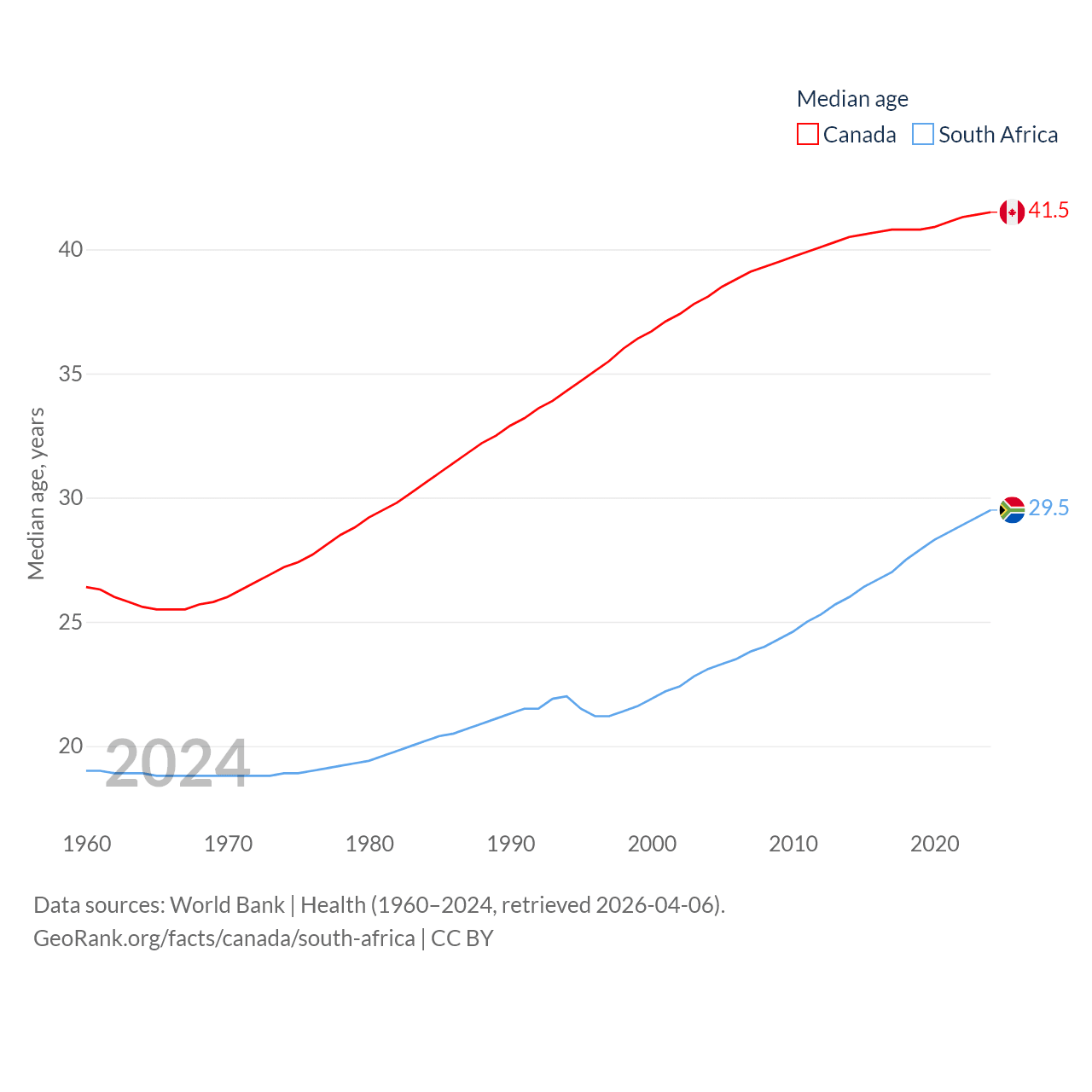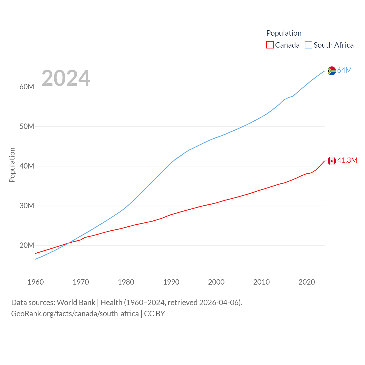 Canada has a population of 41.3M (ranked 37/197), compared with 64M in South Africa (ranked 24/197). Canada's land area is 3,393,336 sq mi versus 468,377 sq mi for South Africa (ranked 4th vs. 24th).