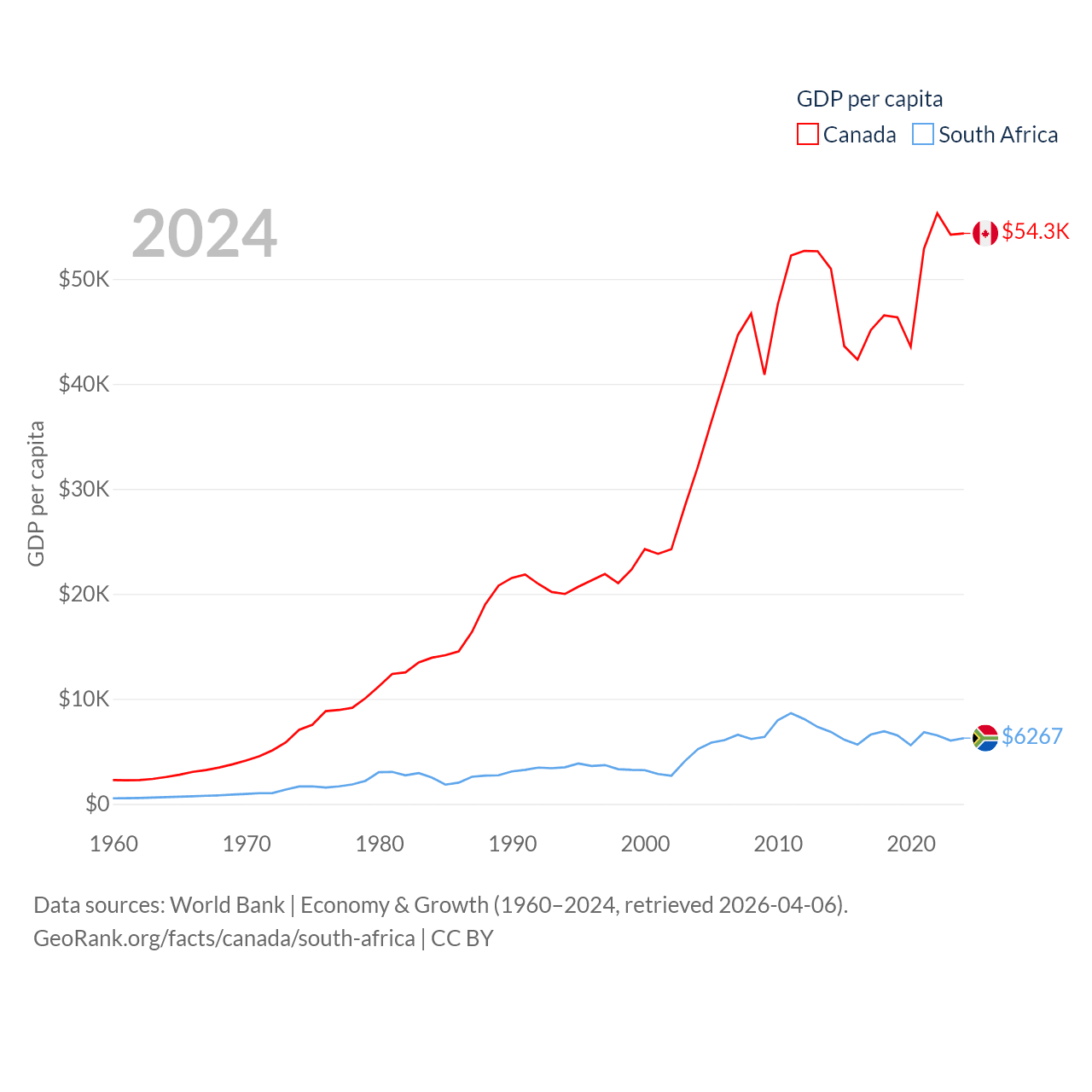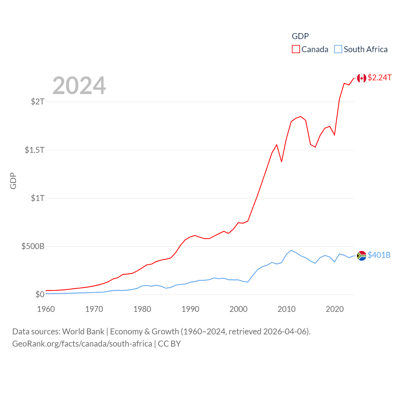 By GDP, Canada ranks 9/197 ($2.24T) and South Africa ranks 40/197 ($401B). By GDP per capita, Canada ranks 20/197 ($54,340), while South Africa ranks 111/197 ($6,267).