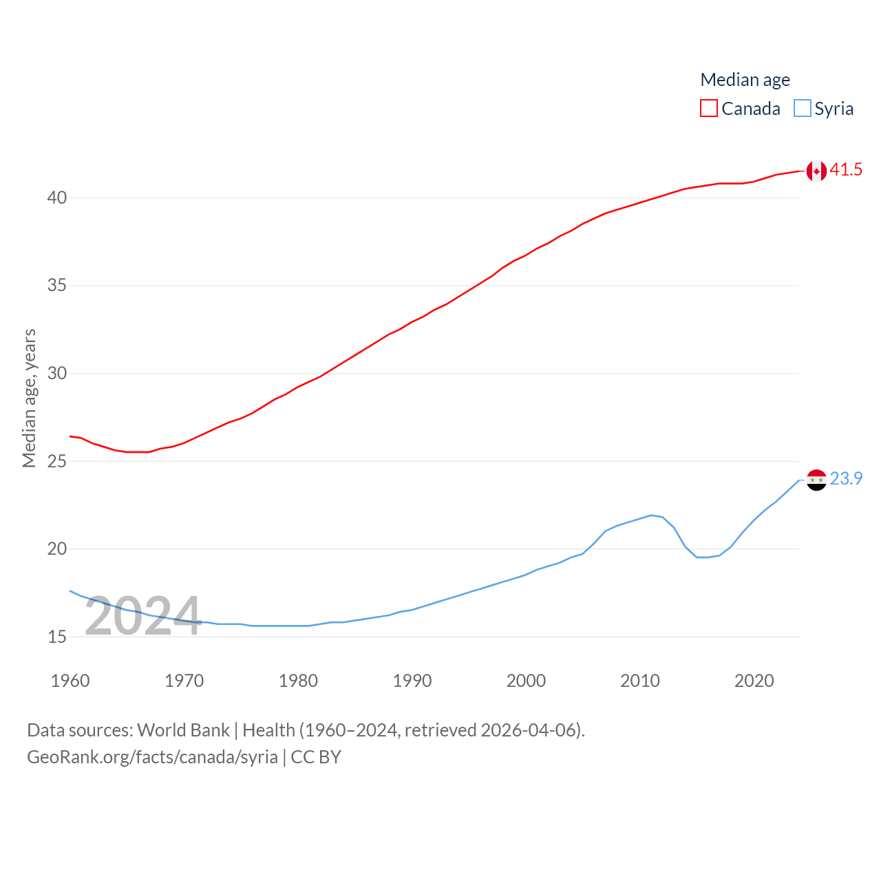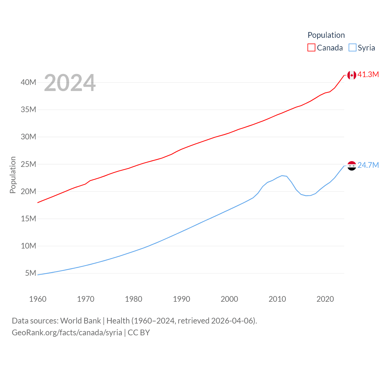 Canada has a population of 41.3M (ranked 37/197), compared with 24.7M in Syria (ranked 57/197). Canada's land area is 3,393,336 sq mi versus 70,900 sq mi for Syria (ranked 4th vs. 87th).