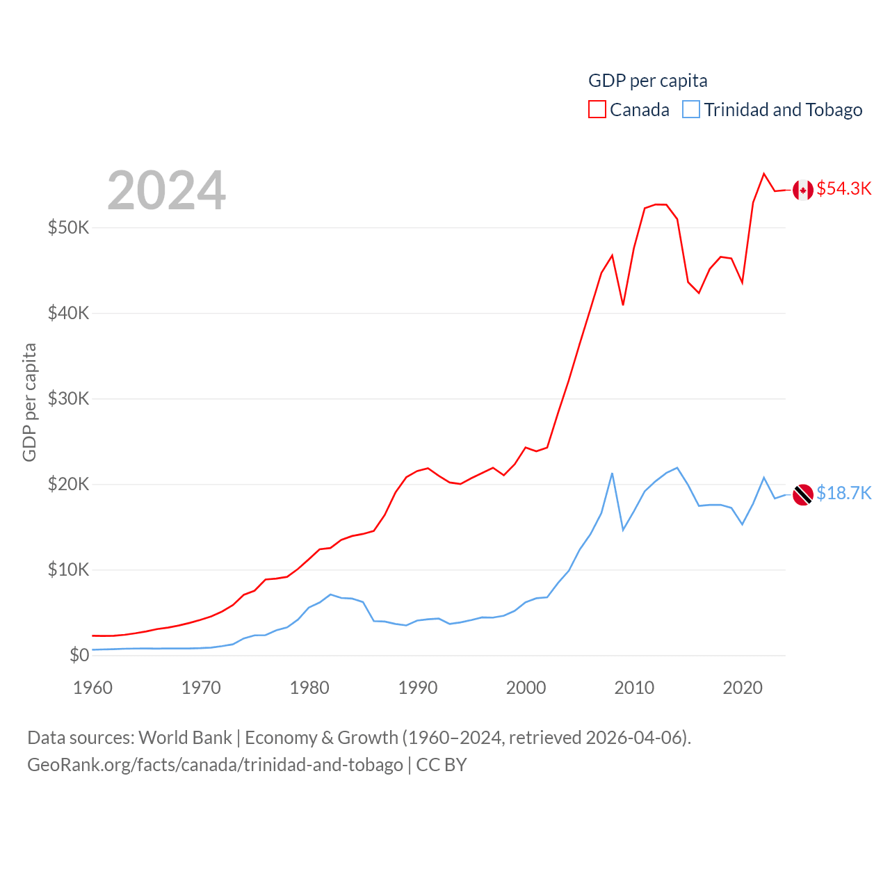 By GDP, Canada ranks 9/197 ($2.24T) and Trinidad and Tobago ranks 115/197 ($25.6B). By GDP per capita, Canada ranks 20/197 ($54,340), while Trinidad and Tobago ranks 61/197 ($18,733).