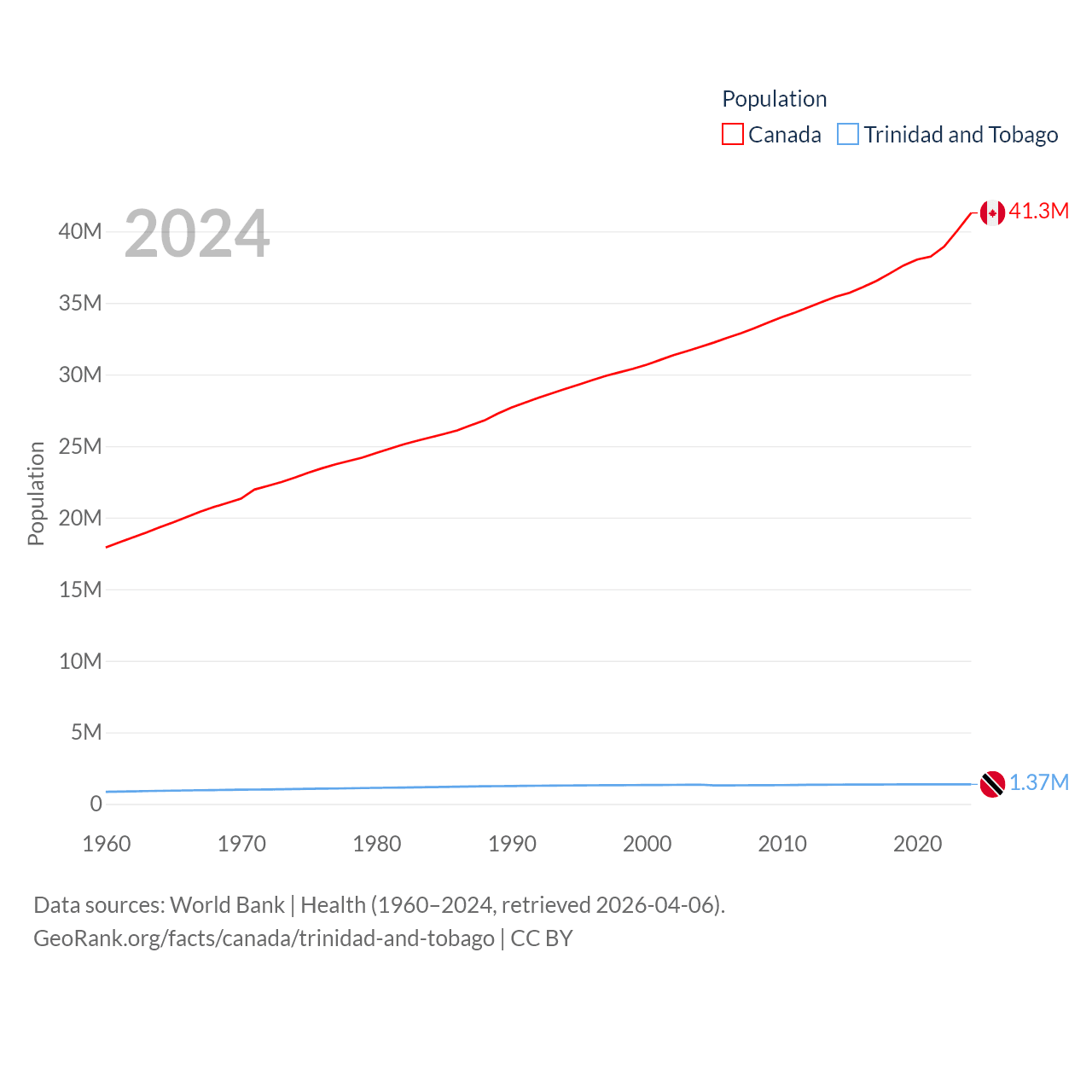 Canada has a population of 41.3M (ranked 37/197), compared with 1.37M in Trinidad and Tobago (ranked 154/197). Canada's land area is 3,393,336 sq mi versus 1,981 sq mi for Trinidad and Tobago (ranked 4th vs. 166th).