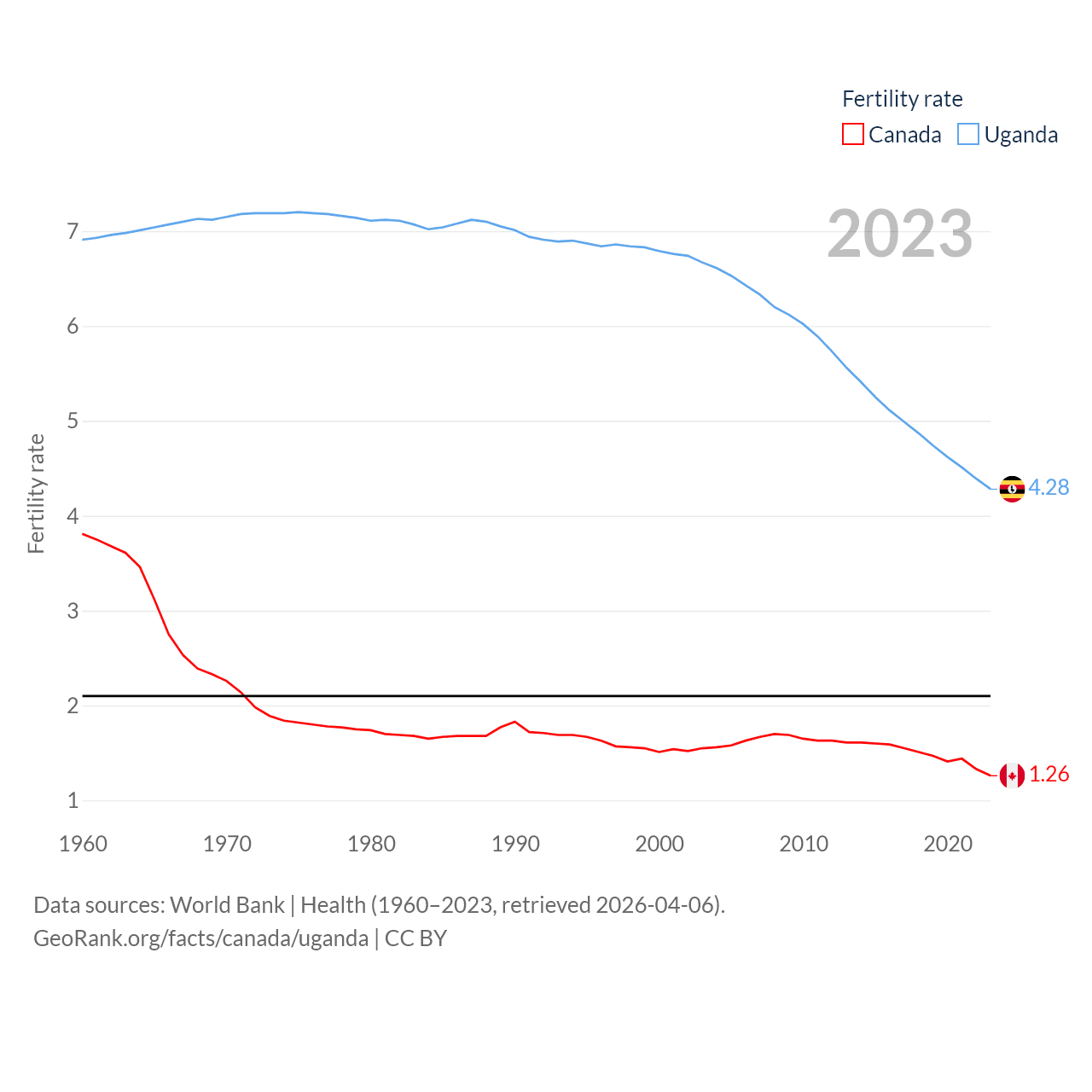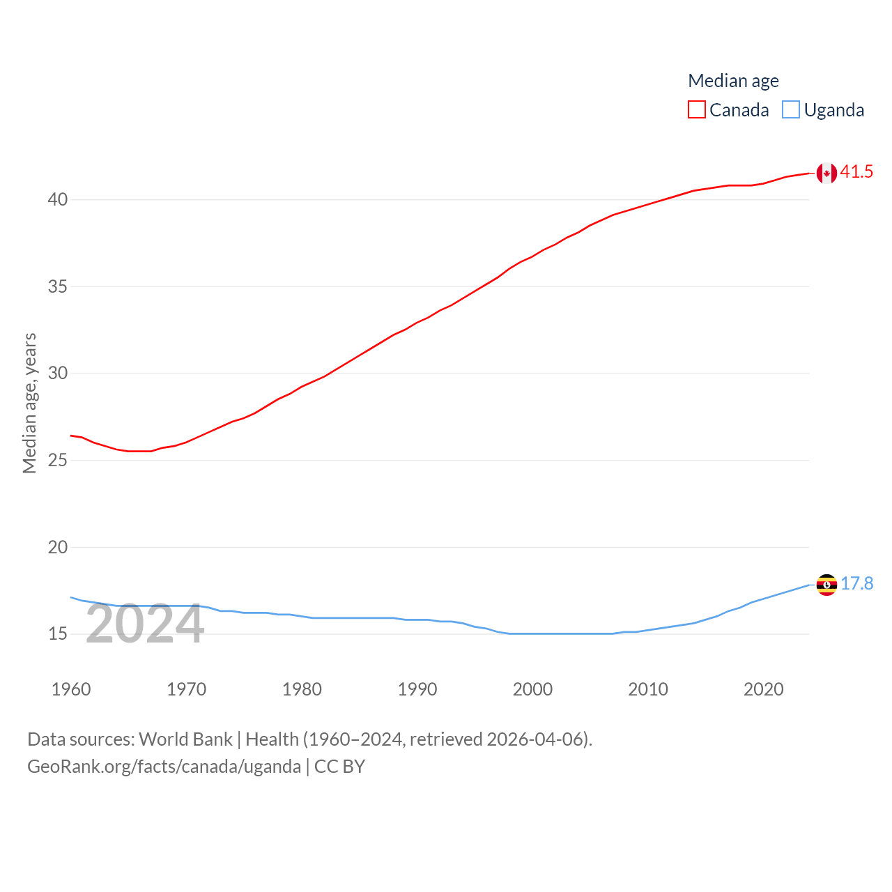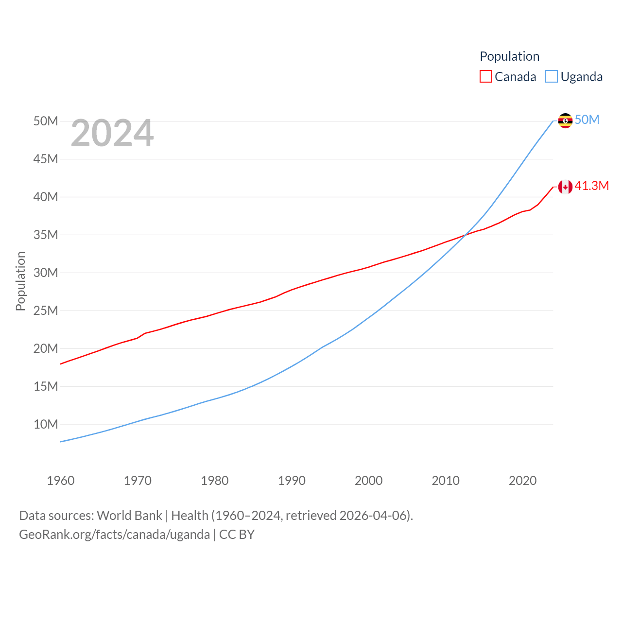 Canada has a population of 41.3M (ranked 37/197), compared with 50M in Uganda (ranked 31/197). Canada's land area is 3,393,336 sq mi versus 77,421 sq mi for Uganda (ranked 4th vs. 84th).