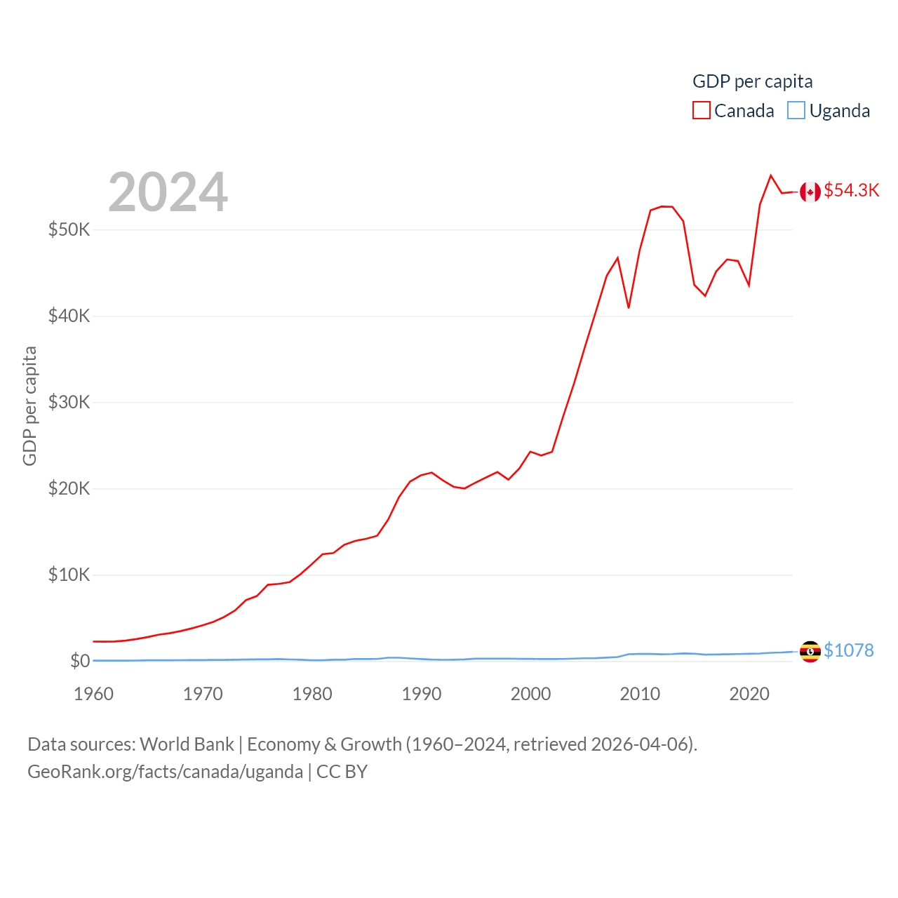 By GDP, Canada ranks 9/197 ($2.24T) and Uganda ranks 89/197 ($53.9B). By GDP per capita, Canada ranks 20/197 ($54,340), while Uganda ranks 176/197 ($1,078).