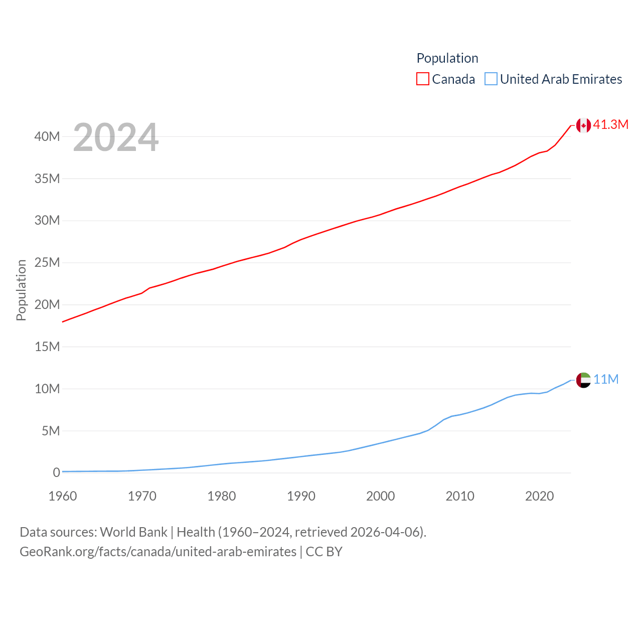 Canada has a population of 41.3M (ranked 37/197), compared with 11M in The United Arab Emirates (ranked 86/197). Canada's land area is 3,393,336 sq mi versus 27,421 sq mi for The United Arab Emirates (ranked 4th vs. 117th).