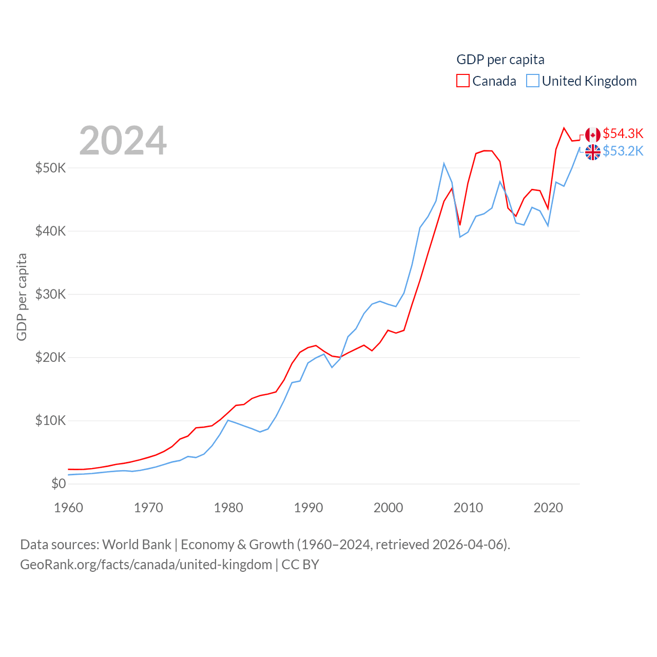 By GDP, Canada ranks 9/197 ($2.24T) and The United Kingdom ranks 6/197 ($3.69T). By GDP per capita, Canada ranks 20/197 ($54,340), while The United Kingdom ranks 22/197 ($53,246).