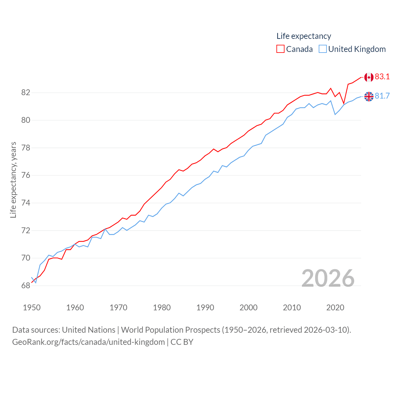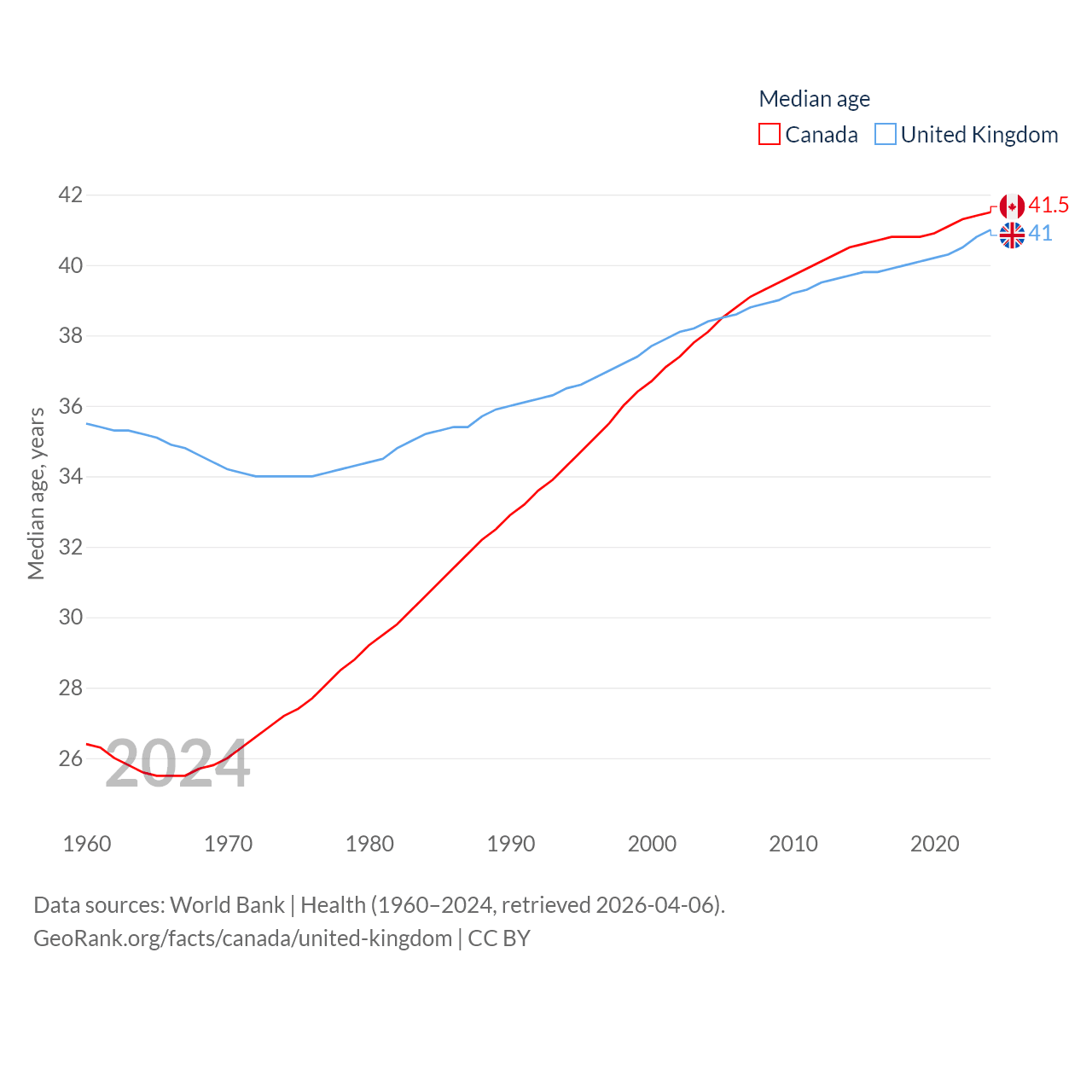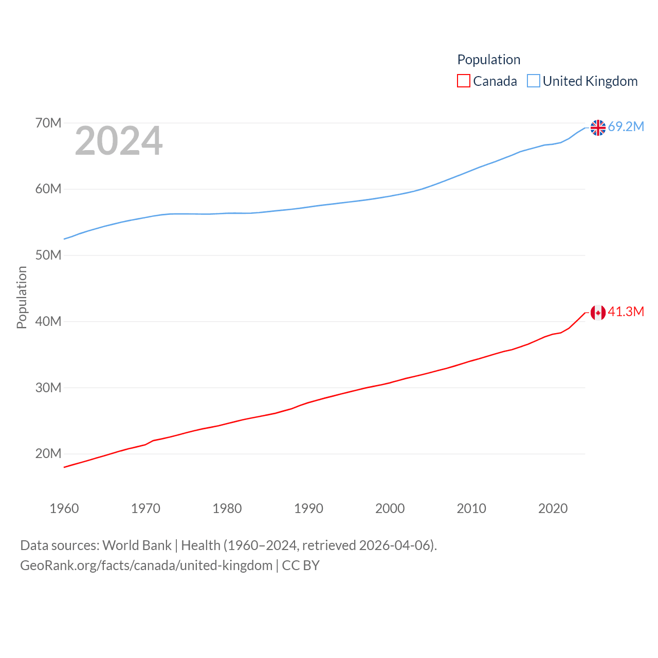 Canada has a population of 41.3M (ranked 37/197), compared with 69.2M in The United Kingdom (ranked 21/197). Canada's land area is 3,393,336 sq mi versus 93,410 sq mi for The United Kingdom (ranked 4th vs. 78th).
