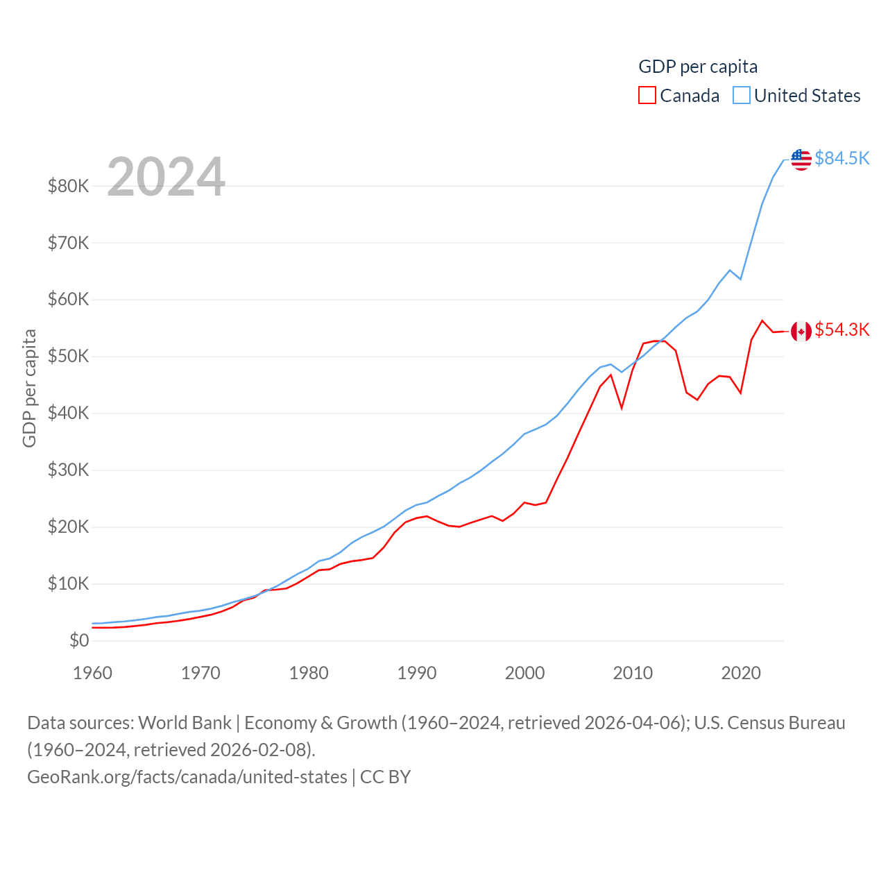 By GDP, Canada ranks 9/197 ($2.24T) and The United States ranks 1/197 ($28.8T). By GDP per capita, Canada ranks 20/197 ($54,340), while The United States ranks 10/197 ($84,534).