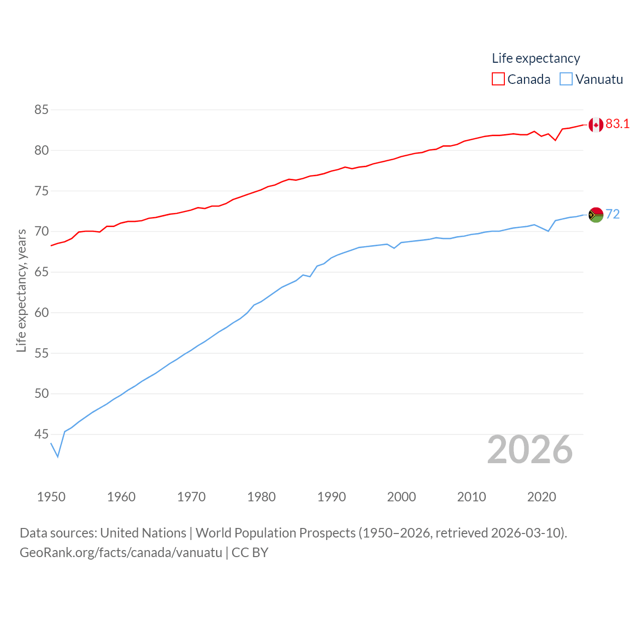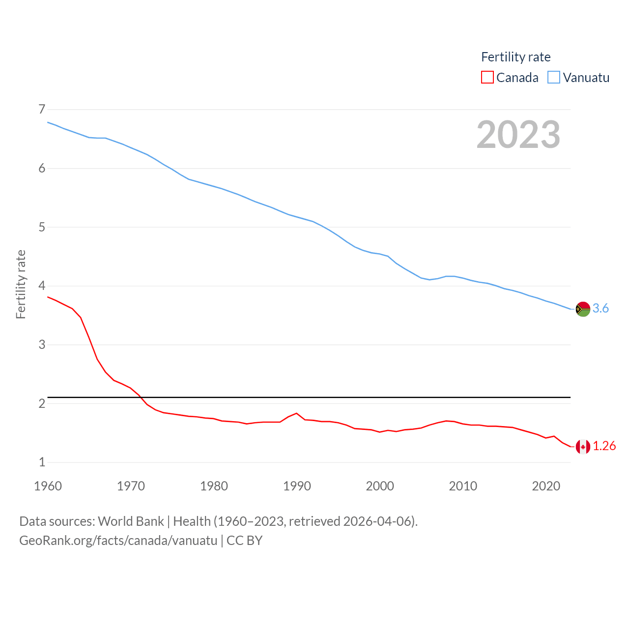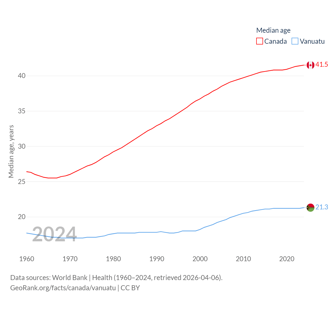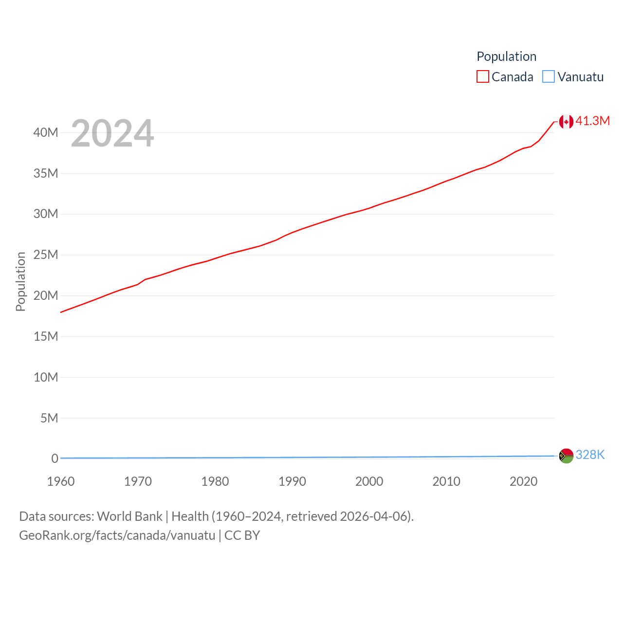 Canada has a population of 41.3M (ranked 37/197), compared with 328K in Vanuatu (ranked 174/197). Canada's land area is 3,393,336 sq mi versus 4,707 sq mi for Vanuatu (ranked 4th vs. 157th).
