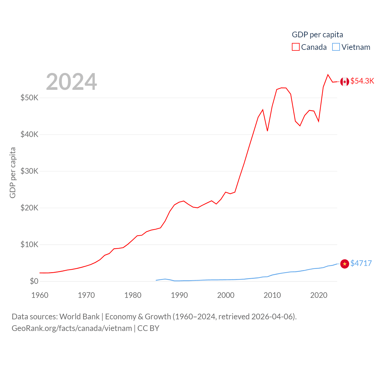 By GDP, Canada ranks 9/197 ($2.24T) and Vietnam ranks 33/197 ($476B). By GDP per capita, Canada ranks 20/197 ($54,340), while Vietnam ranks 122/197 ($4,717).