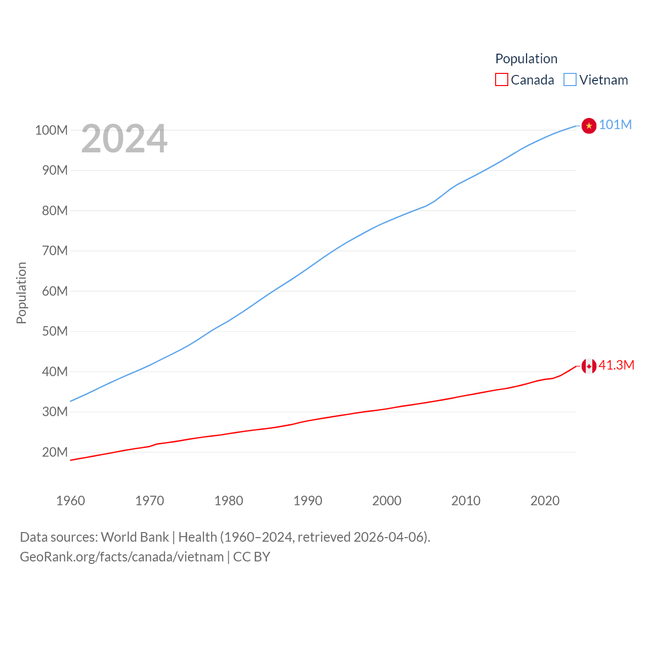 Canada has a population of 41.3M (ranked 37/197), compared with 101M in Vietnam (ranked 16/197). Canada's land area is 3,393,336 sq mi versus 121,016 sq mi for Vietnam (ranked 4th vs. 67th).