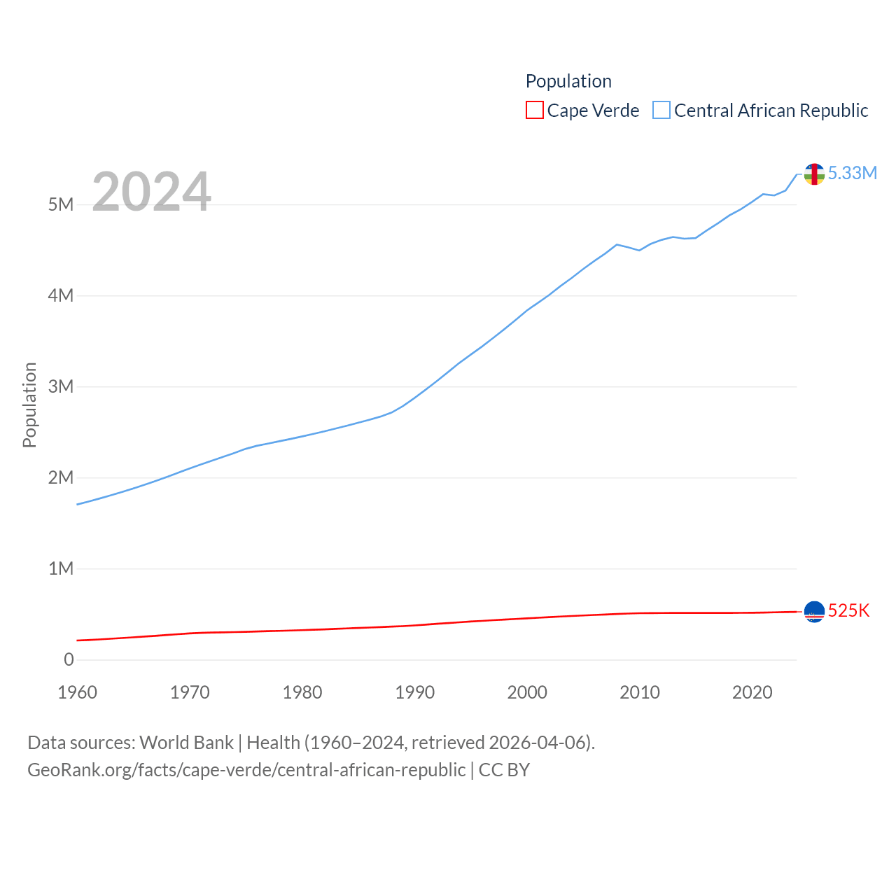 Cape Verde has a population of 525K (ranked 169/197), compared with 5.33M in The Central African Republic (ranked 121/197). Cape Verde's land area is 1,556 sq mi versus 240,534 sq mi for The Central African Republic (ranked 167th vs. 43rd).