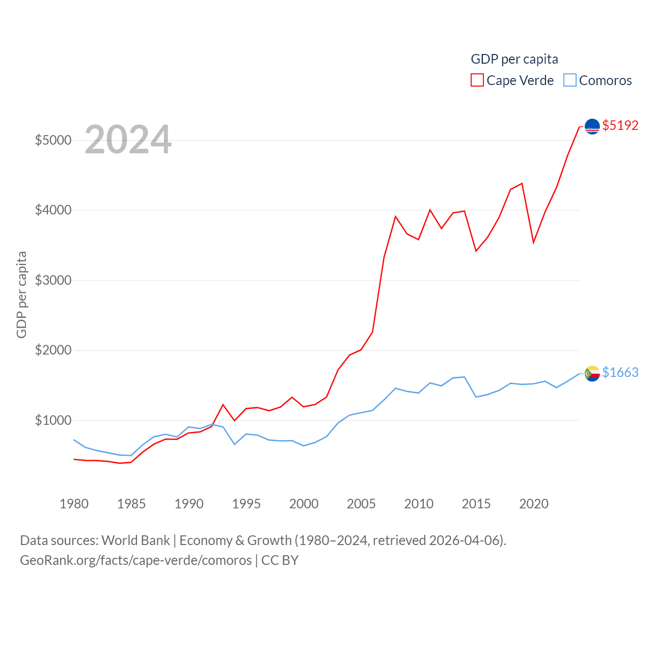 By GDP, Cape Verde ranks 172/197 ($2.73B) and Comoros ranks 183/197 ($1.44B). By GDP per capita, Cape Verde ranks 118/197 ($5,192), while Comoros ranks 161/197 ($1,663).