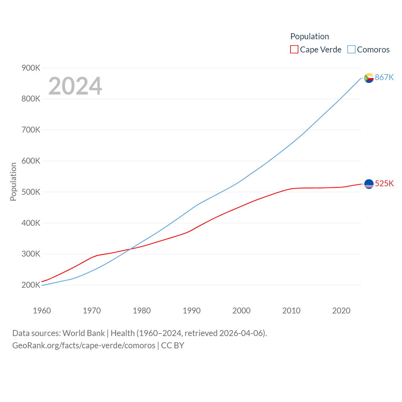 Cape Verde has a population of 525K (ranked 169/197), compared with 867K in Comoros (ranked 160/197). Cape Verde's land area is 1,556 sq mi versus 719 sq mi for Comoros (ranked 167th vs. 171st).