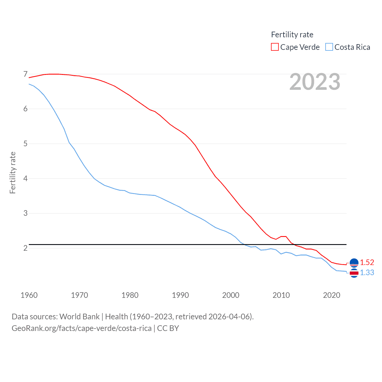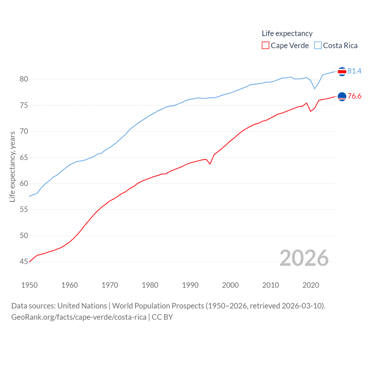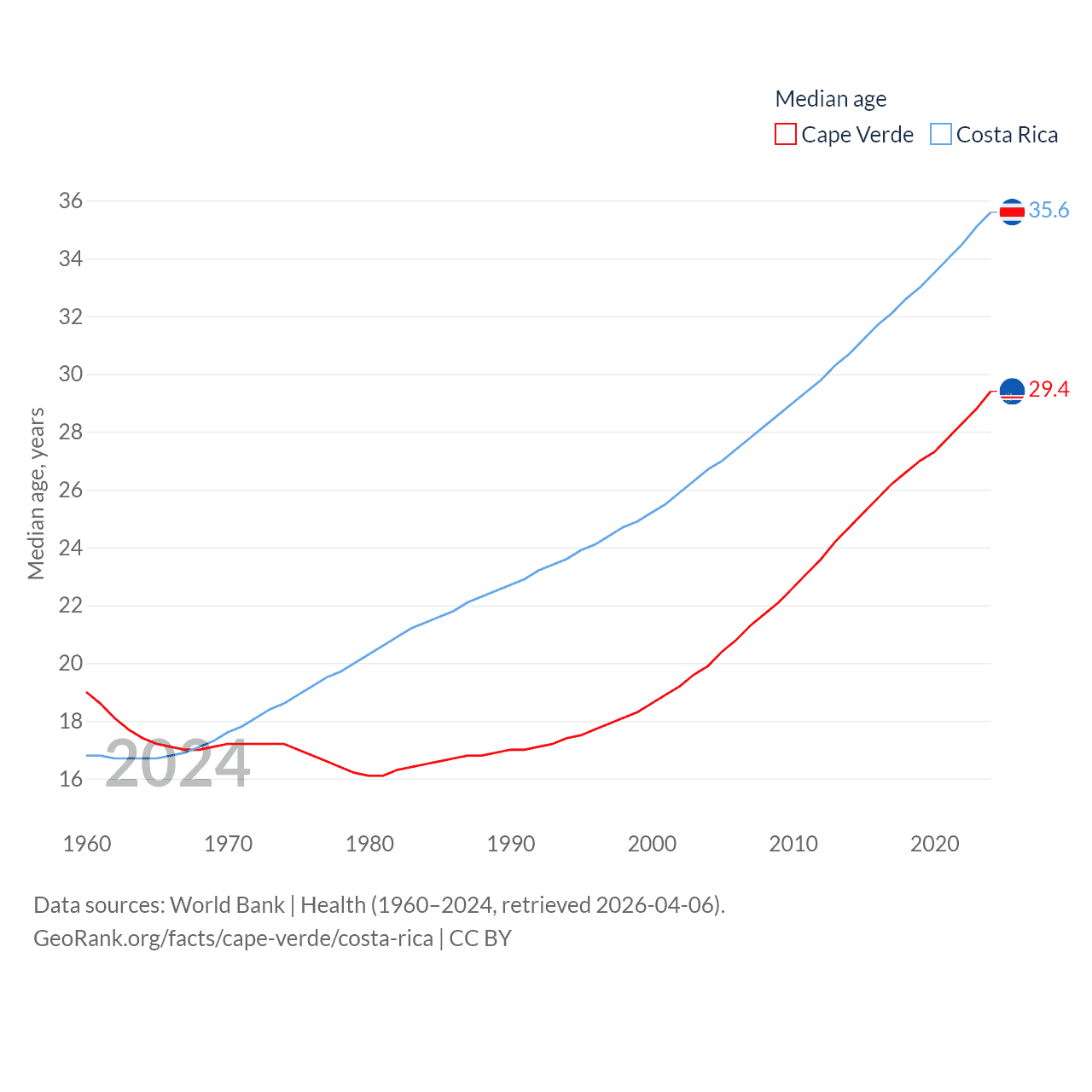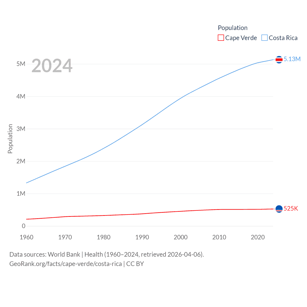Cape Verde has a population of 525K (ranked 169/197), compared with 5.13M in Costa Rica (ranked 126/197). Cape Verde's land area is 1,556 sq mi versus 19,714 sq mi for Costa Rica (ranked 167th vs. 126th).