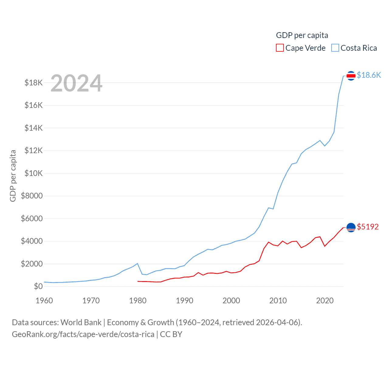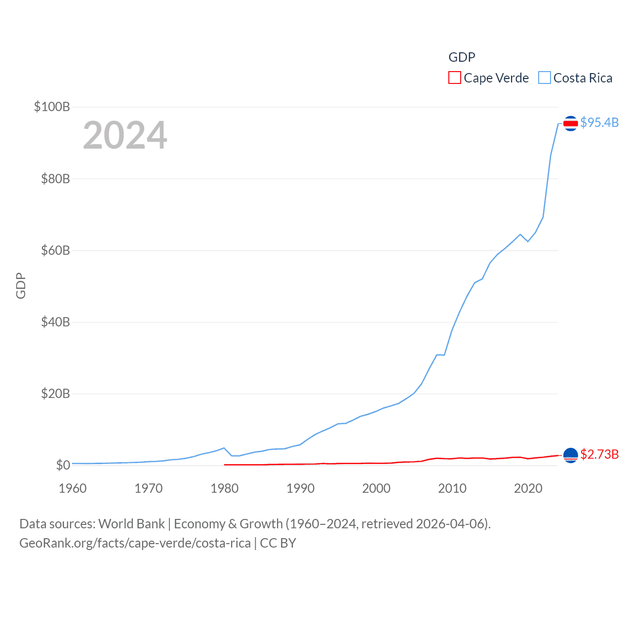 By GDP, Cape Verde ranks 172/197 ($2.73B) and Costa Rica ranks 73/197 ($95.4B). By GDP per capita, Cape Verde ranks 118/197 ($5,192), while Costa Rica ranks 62/197 ($18,587).
