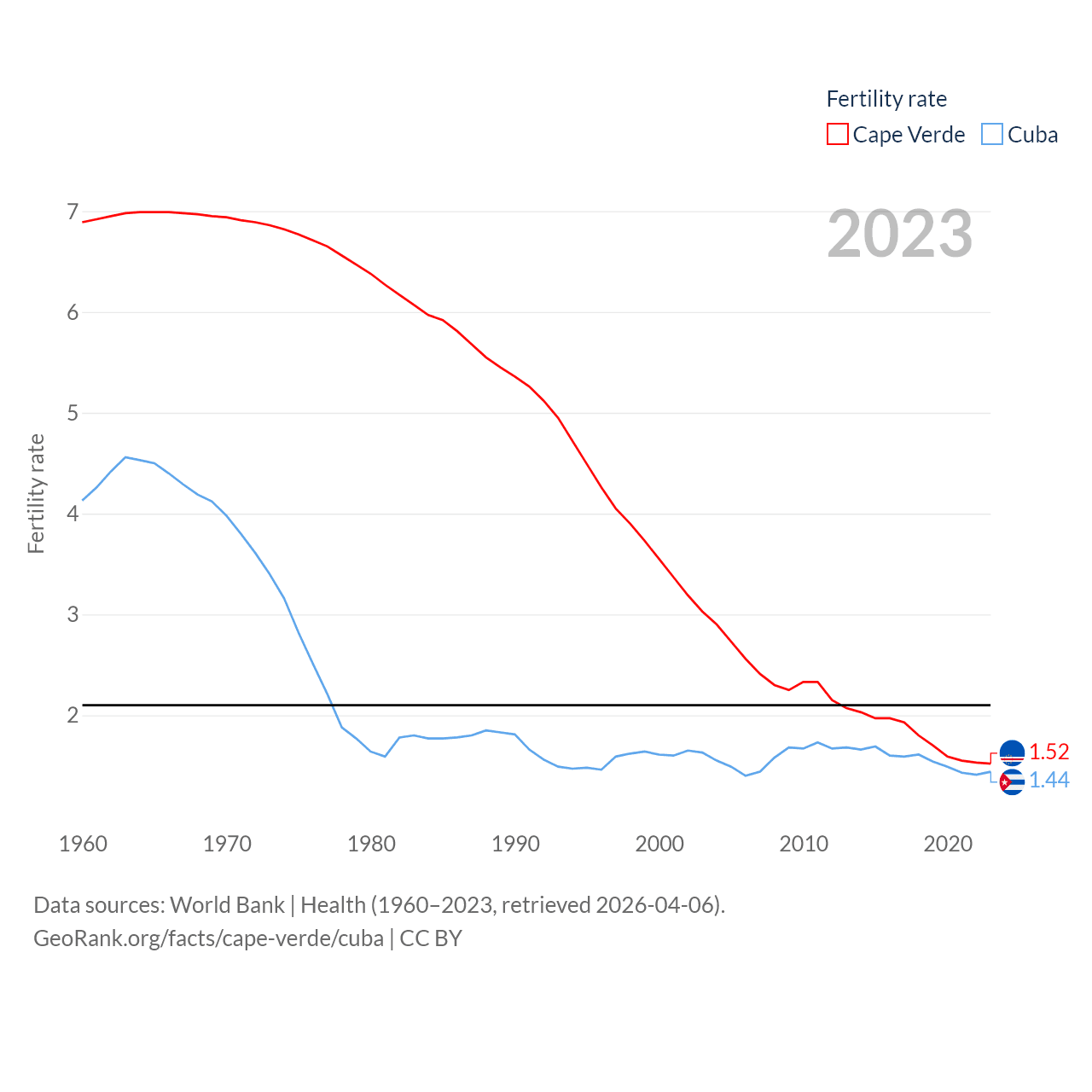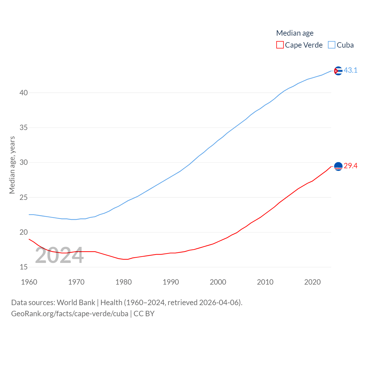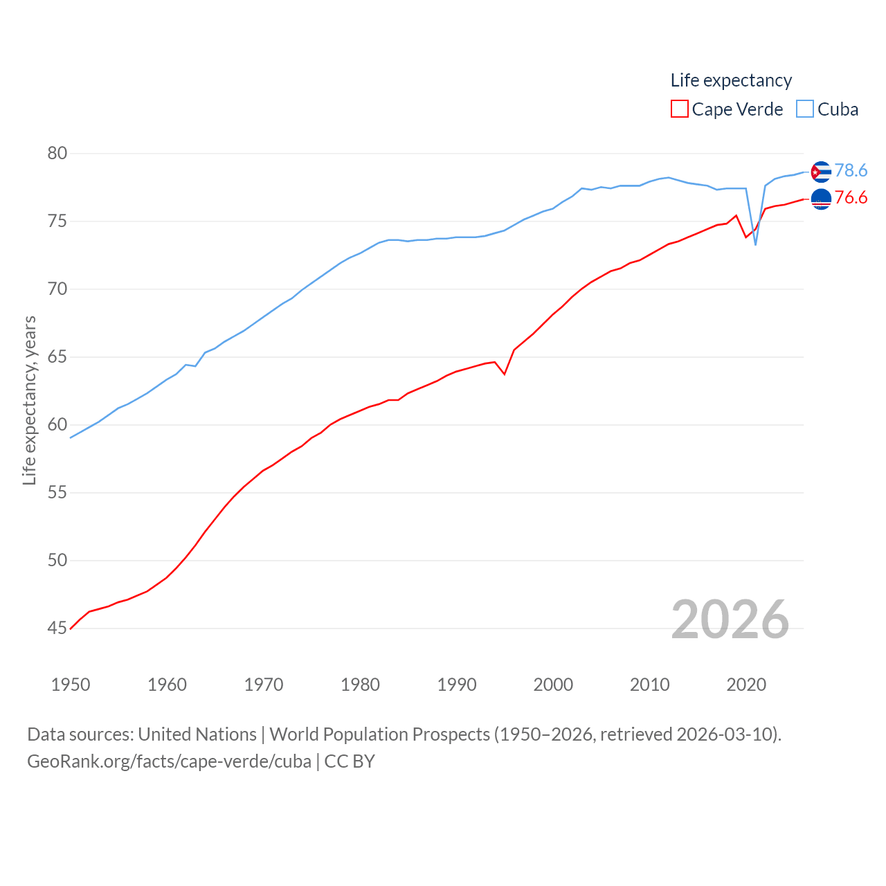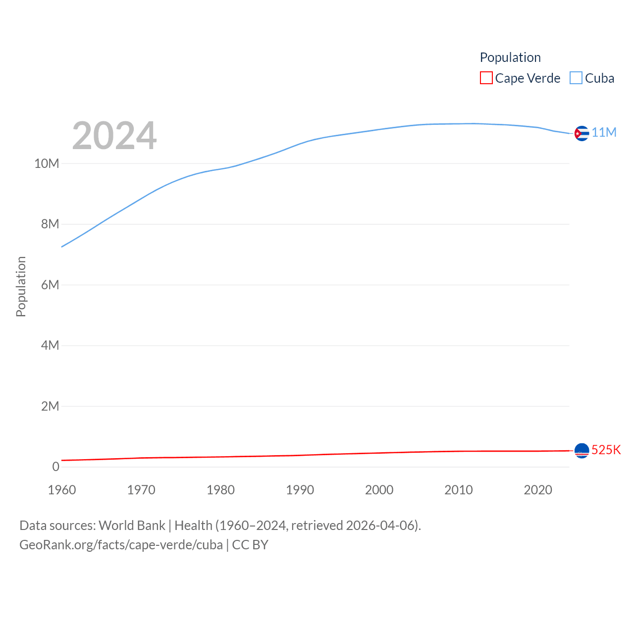 Cape Verde has a population of 525K (ranked 169/197), compared with 11M in Cuba (ranked 87/197). Cape Verde's land area is 1,556 sq mi versus 40,077 sq mi for Cuba (ranked 167th vs. 103rd).