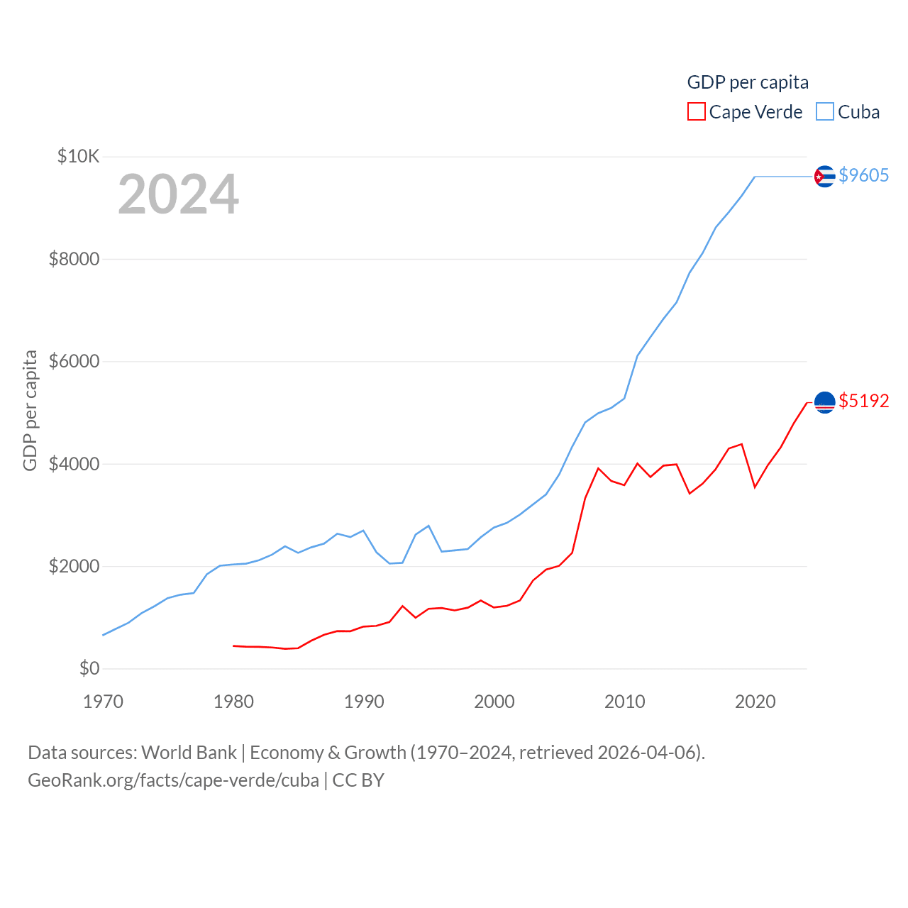 By GDP, Cape Verde ranks 172/197 ($2.73B) and Cuba ranks 69/197 ($107B). By GDP per capita, Cape Verde ranks 118/197 ($5,192), while Cuba ranks 86/197 ($9,605).