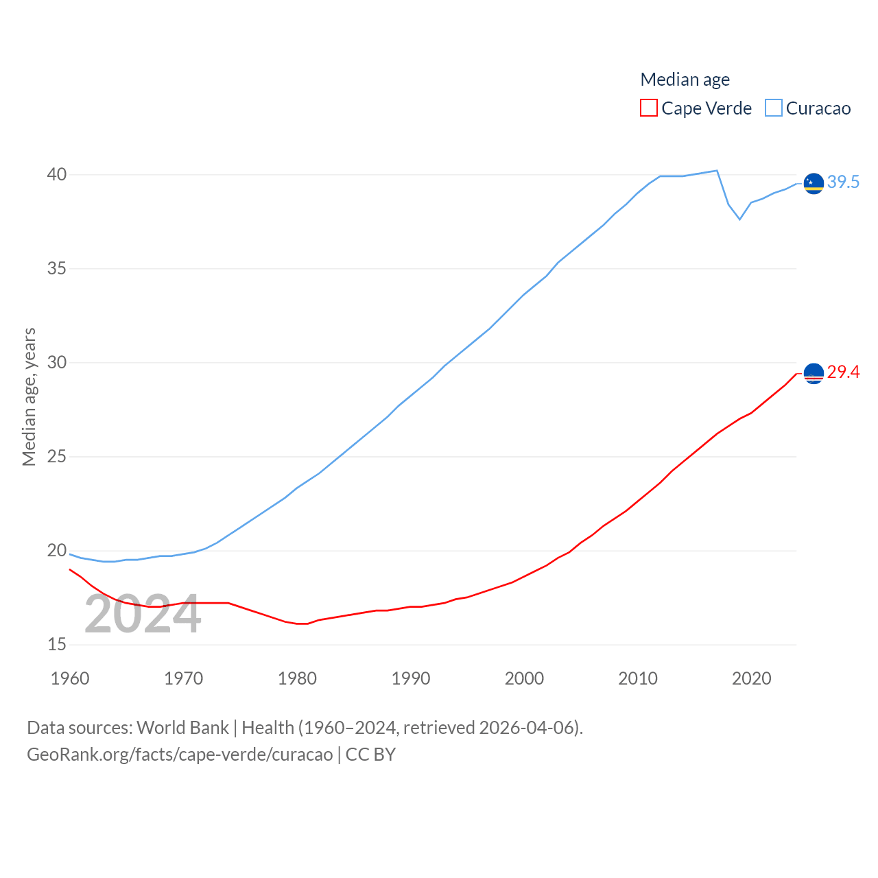 Cape Verde has a population of 525K (ranked 169/197), compared with 156K in Curacao (ranked 179/197). Cape Verde's land area is 1,556 sq mi versus 171.4 sq mi for Curacao (ranked 167th vs. 182nd).