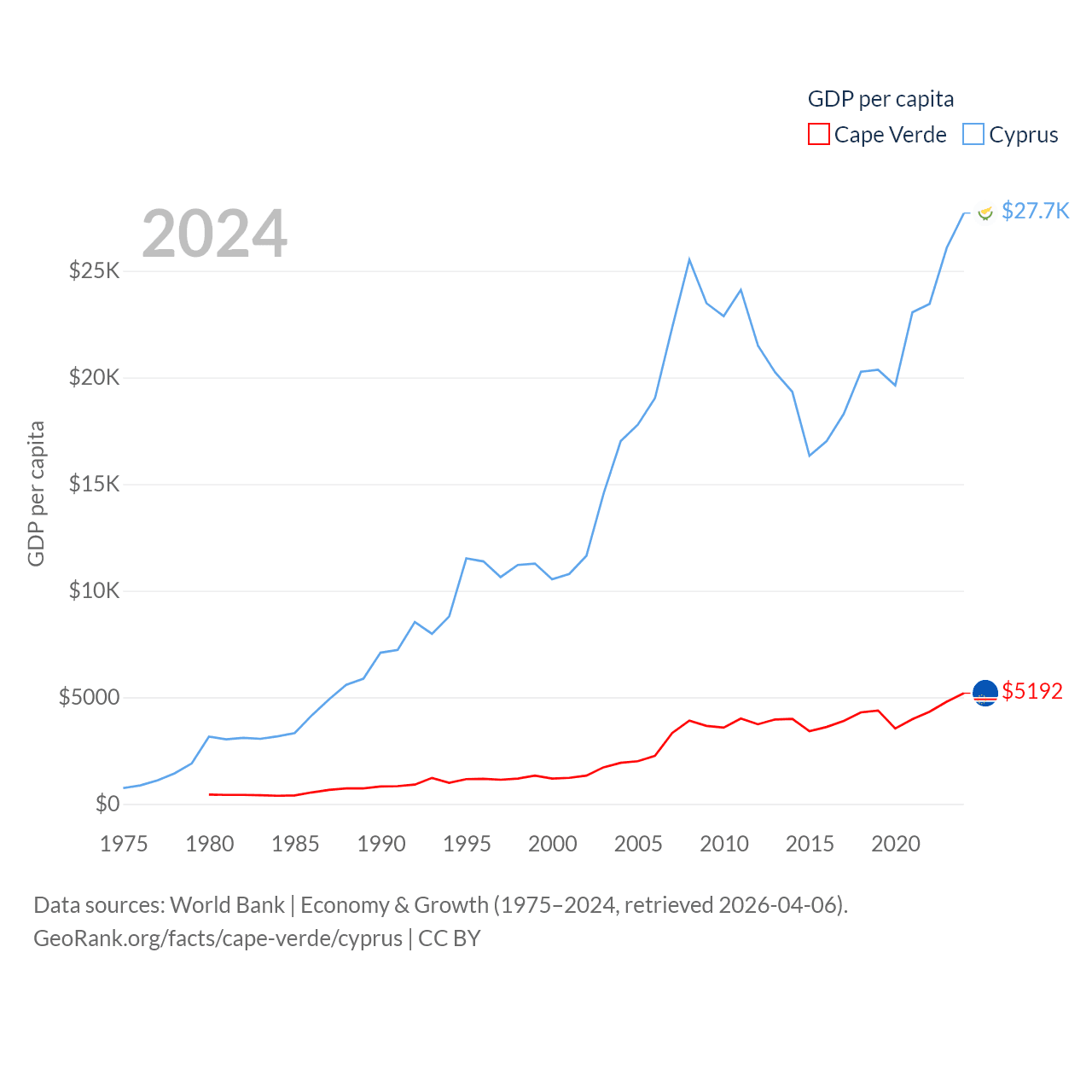By GDP, Cape Verde ranks 172/197 ($2.73B) and Cyprus ranks 103/197 ($37.6B). By GDP per capita, Cape Verde ranks 118/197 ($5,192), while Cyprus ranks 45/197 ($27,707).