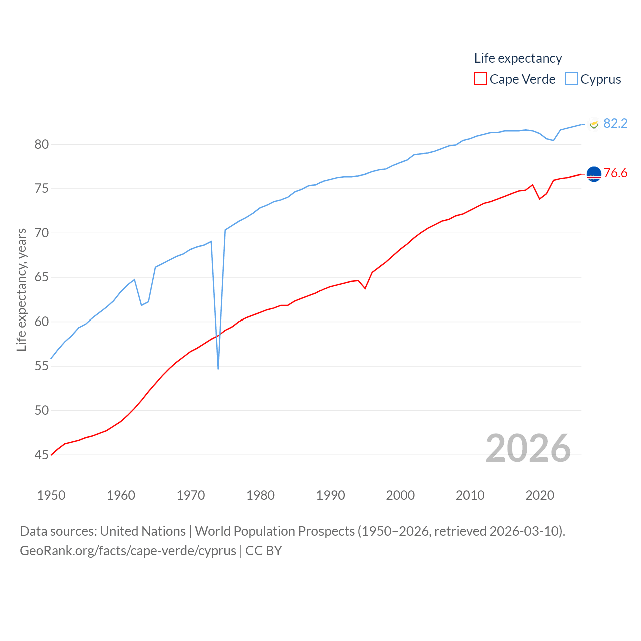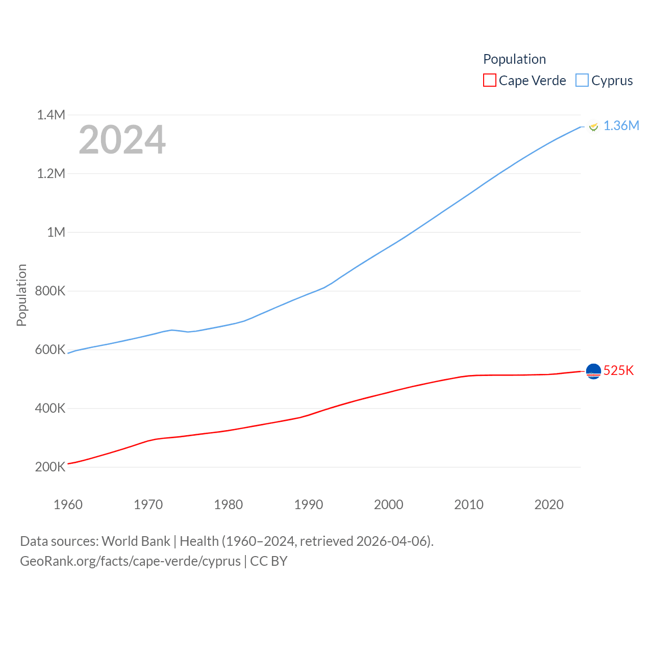 Cape Verde has a population of 525K (ranked 169/197), compared with 1.36M in Cyprus (ranked 155/197). Cape Verde's land area is 1,556 sq mi versus 3,568 sq mi for Cyprus (ranked 167th vs. 163rd).