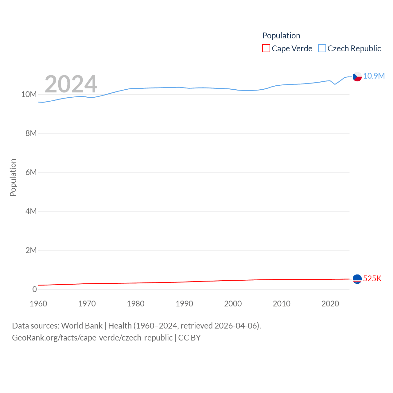 Cape Verde has a population of 525K (ranked 169/197), compared with 10.9M in The Czech Republic (ranked 88/197). Cape Verde's land area is 1,556 sq mi versus 29,794 sq mi for The Czech Republic (ranked 167th vs. 114th).