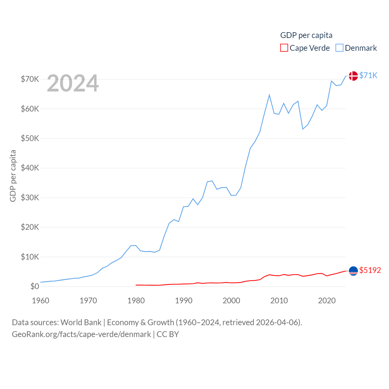 By GDP, Cape Verde ranks 172/197 ($2.73B) and Denmark ranks 37/197 ($425B). By GDP per capita, Cape Verde ranks 118/197 ($5,192), while Denmark ranks 12/197 ($71,026).