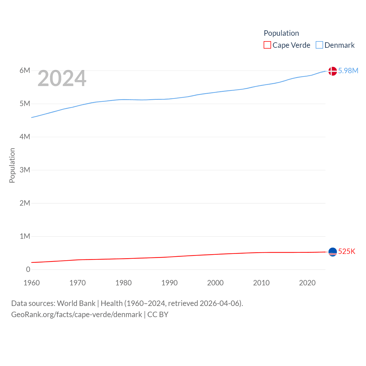 Cape Verde has a population of 525K (ranked 169/197), compared with 5.98M in Denmark (ranked 114/197). Cape Verde's land area is 1,556 sq mi versus 15,444 sq mi for Denmark (ranked 167th vs. 130th).
