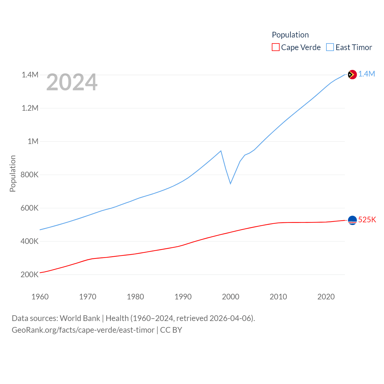 Cape Verde has a population of 525K (ranked 169/197), compared with 1.4M in East Timor (ranked 152/197). Cape Verde's land area is 1,556 sq mi versus 5,741 sq mi for East Timor (ranked 167th vs. 155th).