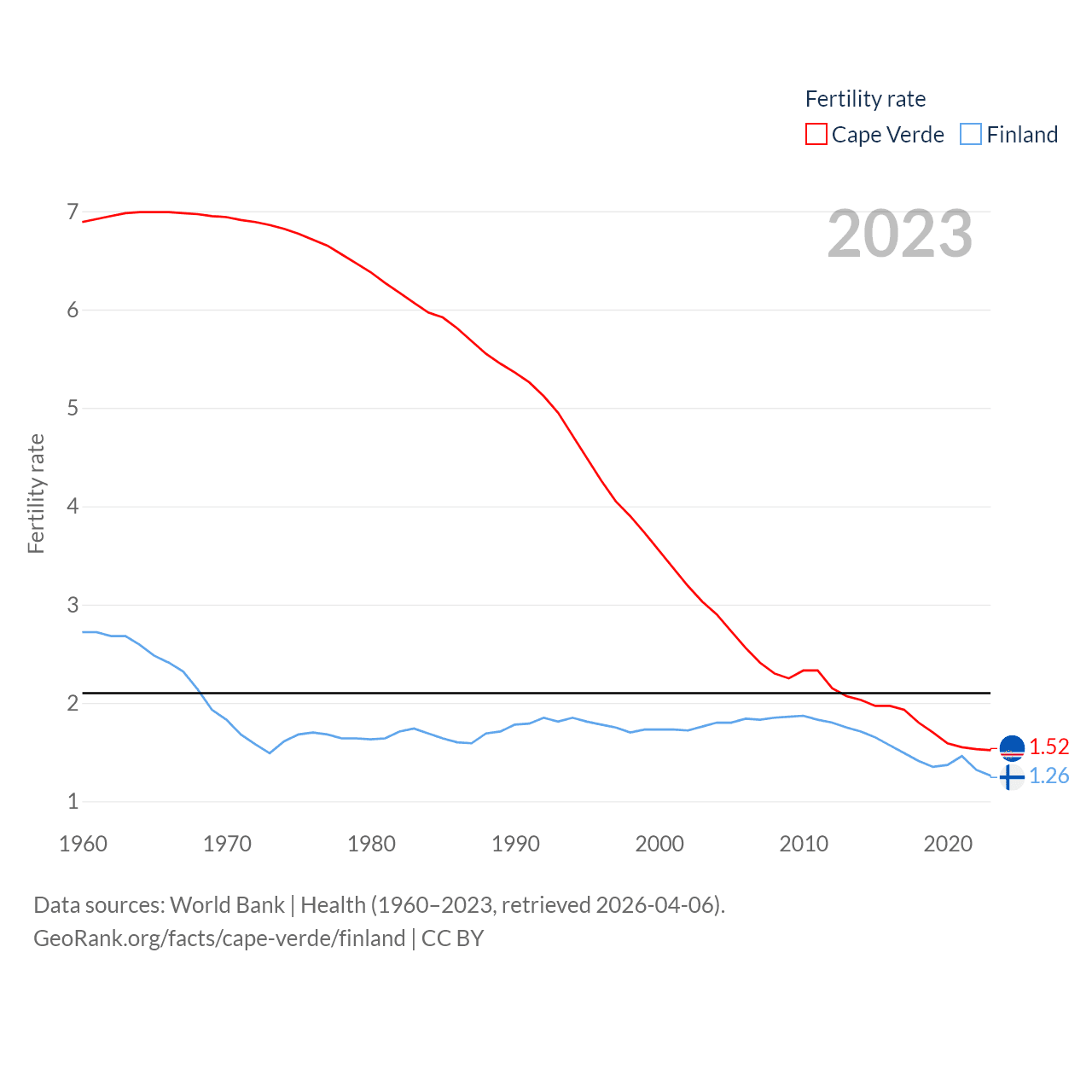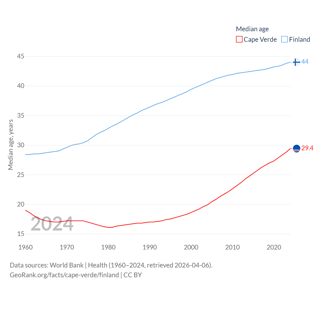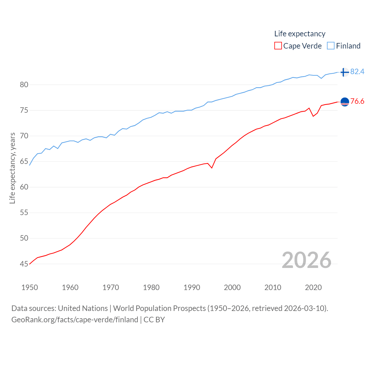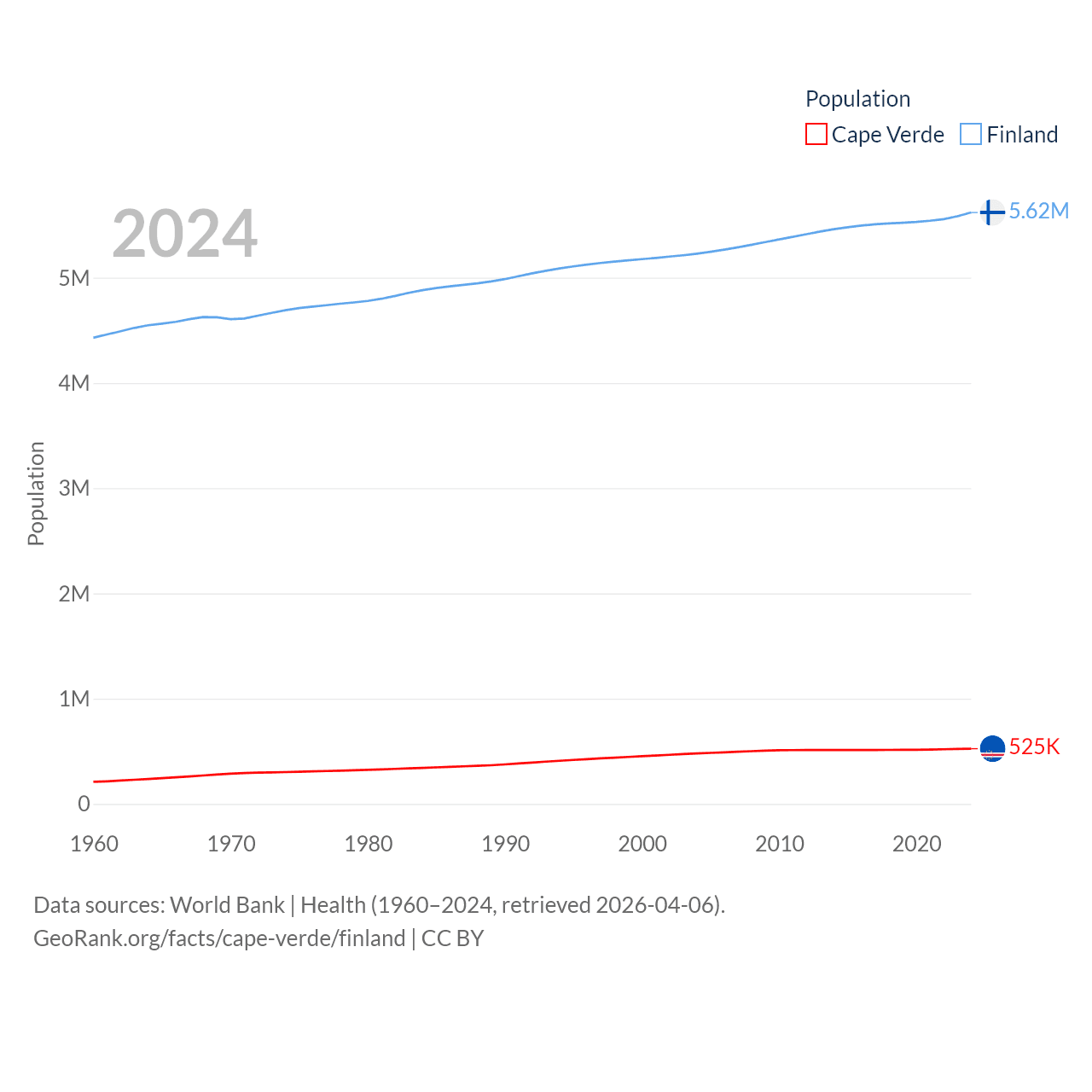 Cape Verde has a population of 525K (ranked 169/197), compared with 5.62M in Finland (ranked 116/197). Cape Verde's land area is 1,556 sq mi versus 117,360 sq mi for Finland (ranked 167th vs. 70th).