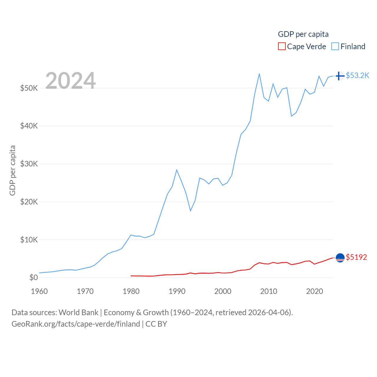 By GDP, Cape Verde ranks 172/197 ($2.73B) and Finland ranks 47/197 ($299B). By GDP per capita, Cape Verde ranks 118/197 ($5,192), while Finland ranks 23/197 ($53,150).