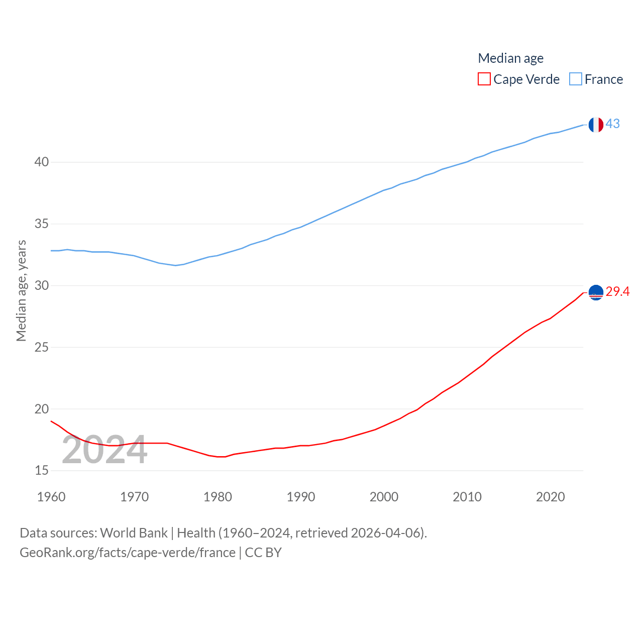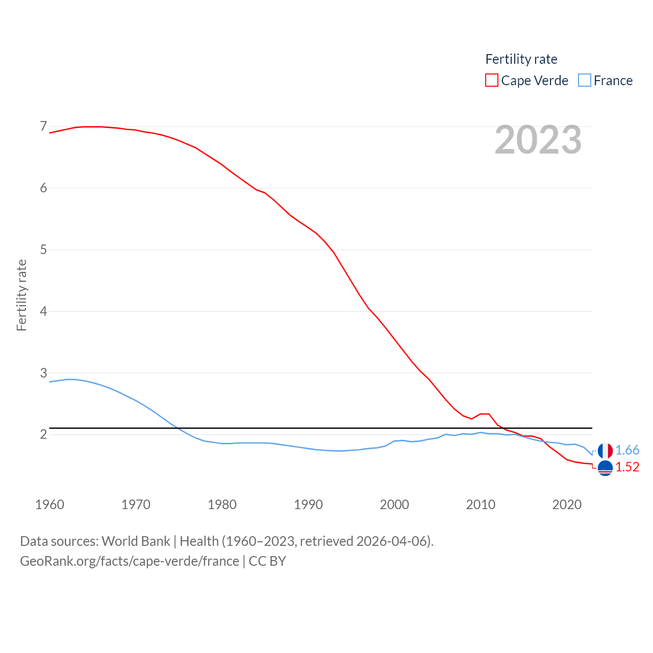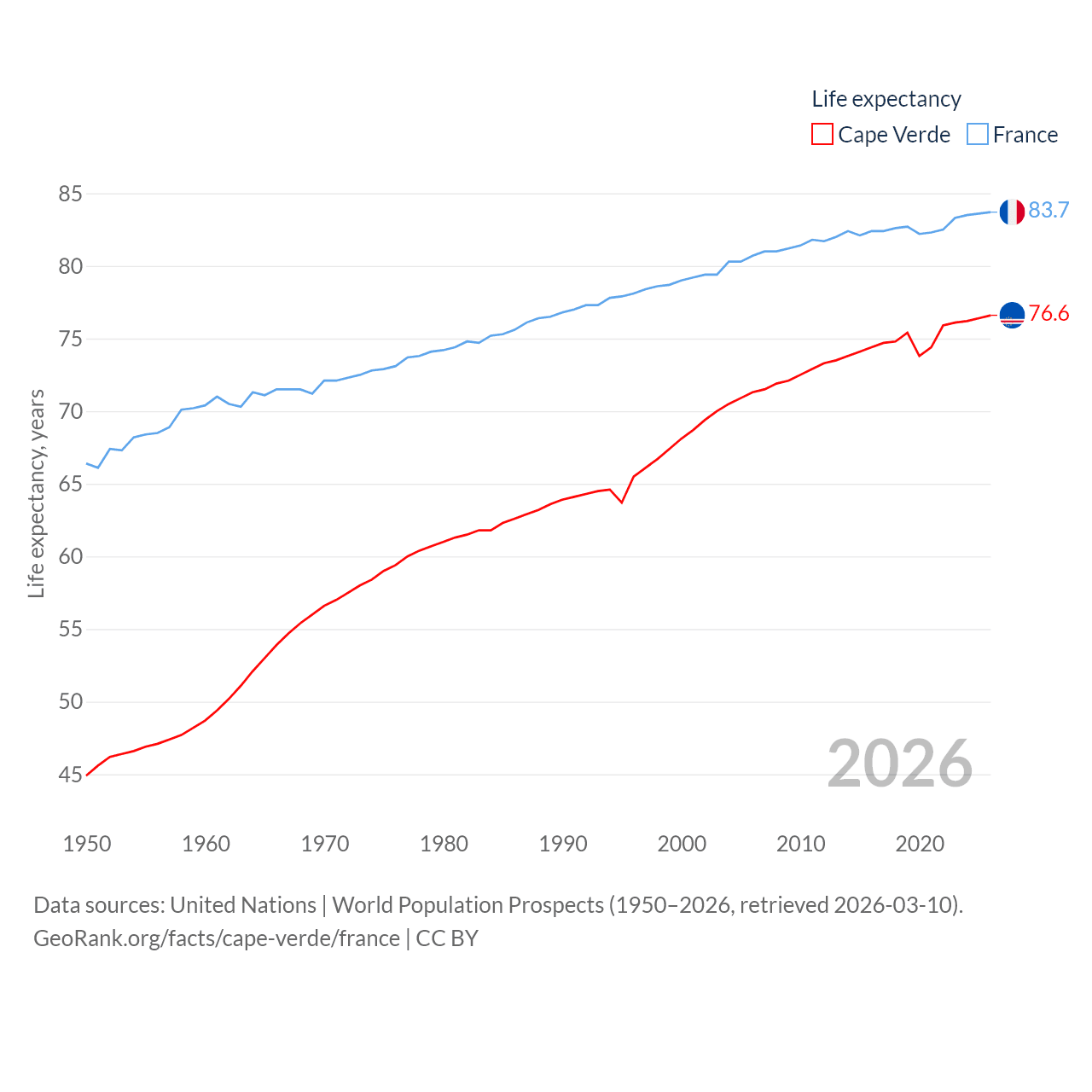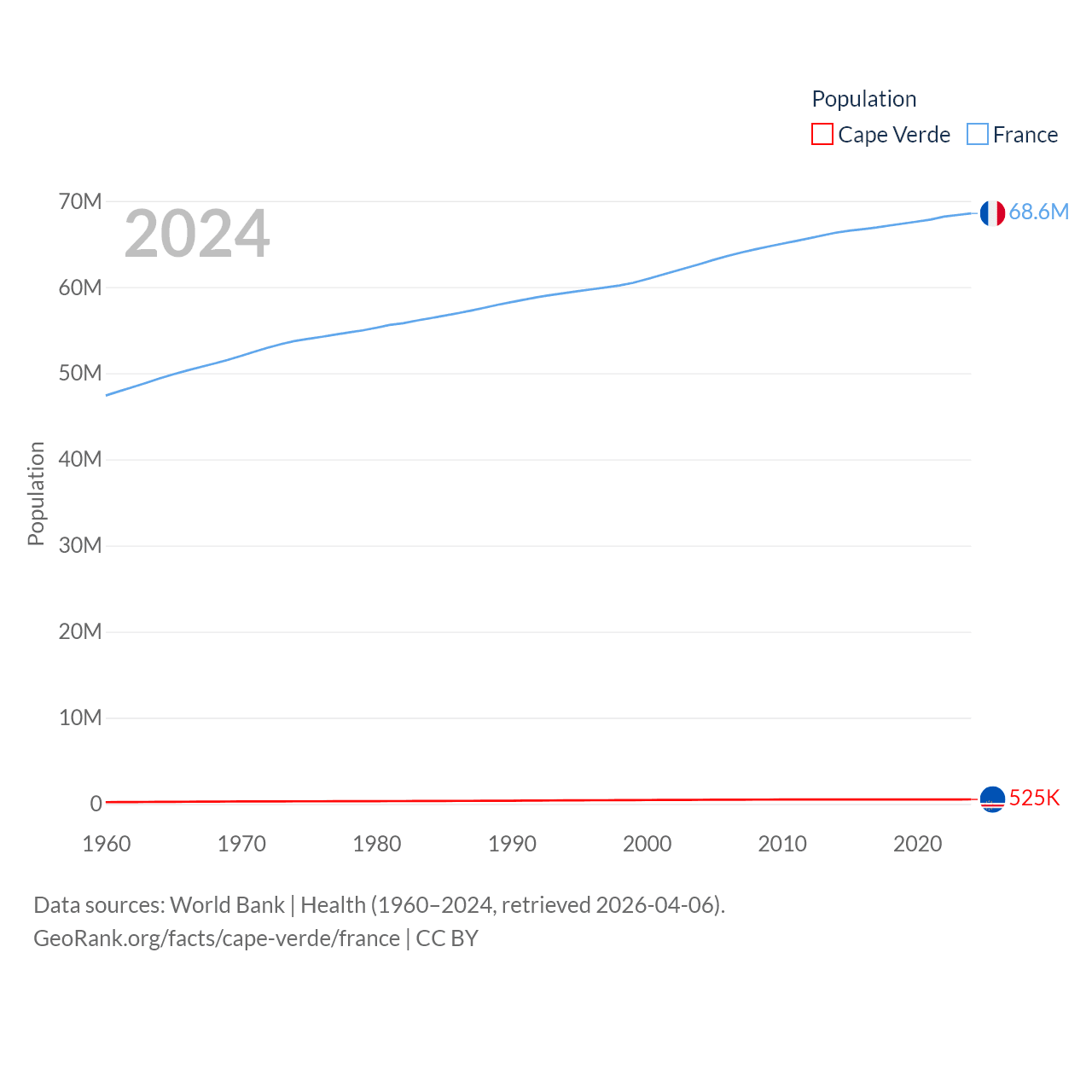 Cape Verde has a population of 525K (ranked 169/197), compared with 68.6M in France (ranked 23/197). Cape Verde's land area is 1,556 sq mi versus 208,090 sq mi for France (ranked 167th vs. 48th).