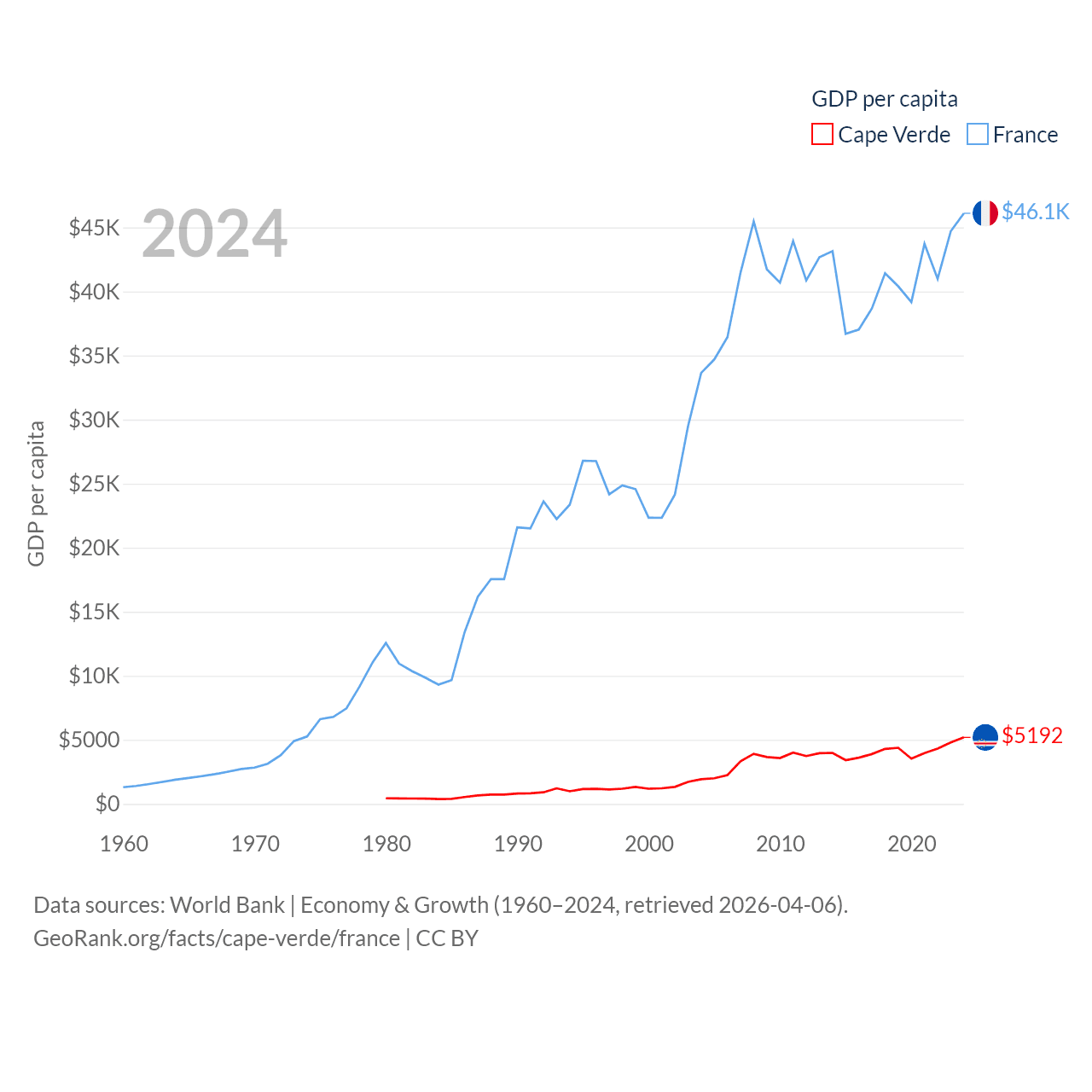 By GDP, Cape Verde ranks 172/197 ($2.73B) and France ranks 7/197 ($3.16T). By GDP per capita, Cape Verde ranks 118/197 ($5,192), while France ranks 27/197 ($46,103).